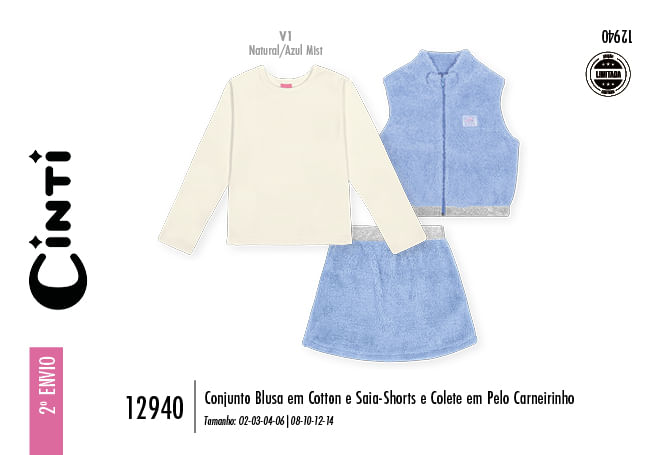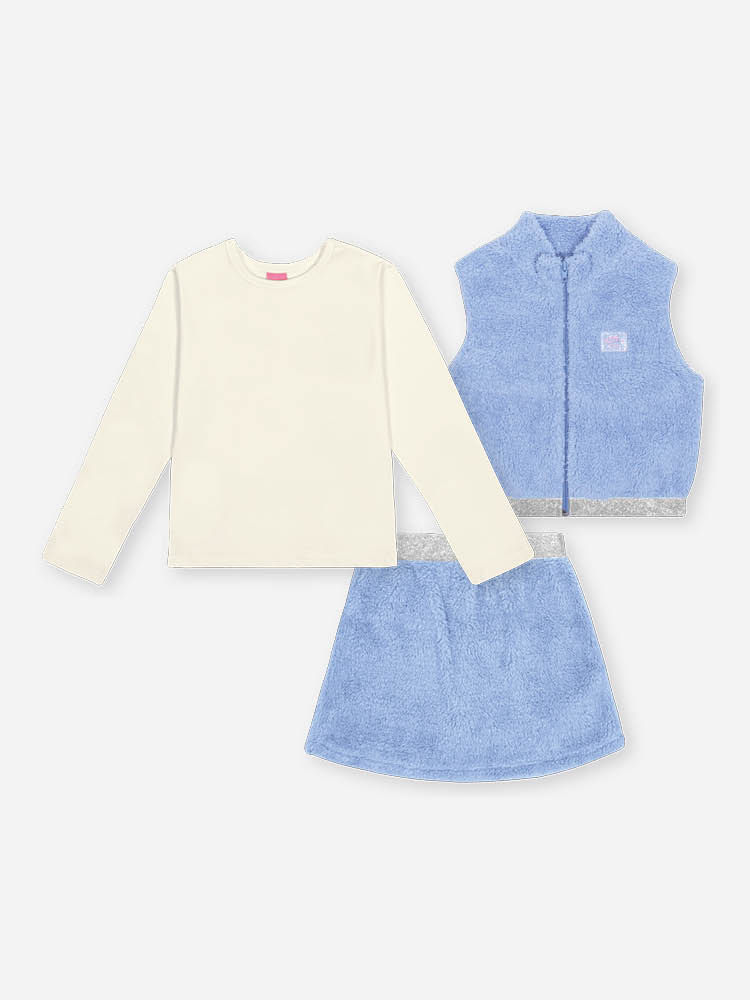 "Este deslumbrante conjunto infantil feminino de três peças da coleção Inverno 2026 é a aposta ideal para quem busca um visual fashionista e extremamente aconchegante. O conjunto é composto por uma blusa básica em cotton macio, um colete boxy e uma saia-shorts, ambos confeccionados em pelo carneirinho, um tecido que é tendência absoluta por seu toque ultra macio e excelente retenção térmica. O colete possui fechamento em zíper de nylon e gola alta, enquanto a saia-shorts garante total segurança para as brincadeiras com o shorts interno em cotton, unindo a delicadeza estética à praticidade necessária no dia a dia.