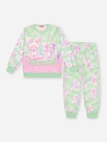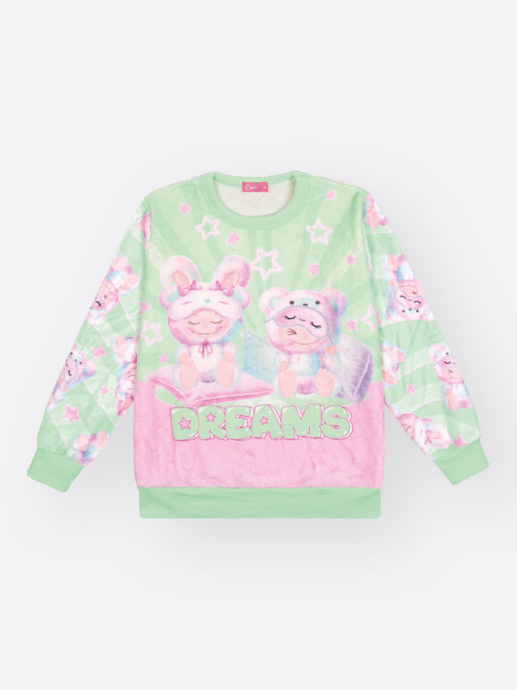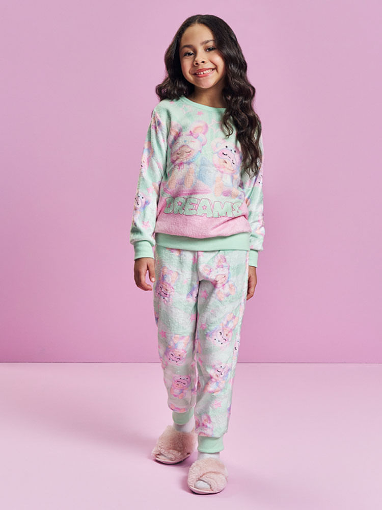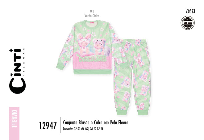 "Este aconchegante conjunto infantil feminino da coleção Inverno 2026 é o verdadeiro abraço de conforto para os dias mais gelados. Confeccionado inteiramente em pelo fleece, o conjunto oferece um toque ultra macio e uma excelente retenção térmica, garantindo que as pequenas fiquem aquecidas com leveza e muito estilo. O blusão de manga longa destaca-se por sua estampa frontal lúdica e delicada, que ganha vida com a padronagem rotativa presente nas mangas e nas costas, criando um visual coordenado e cheio de doçura.