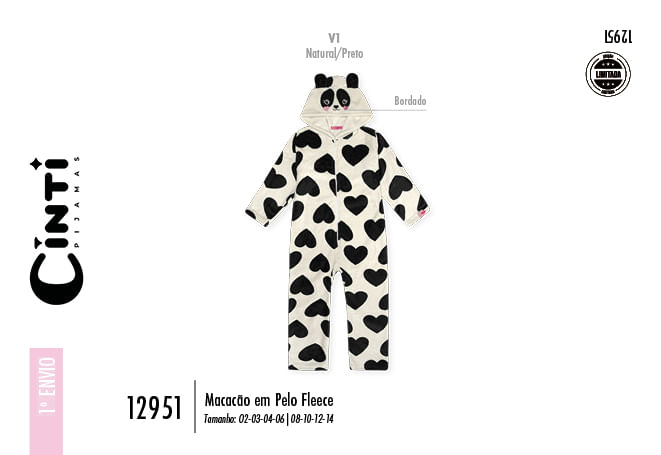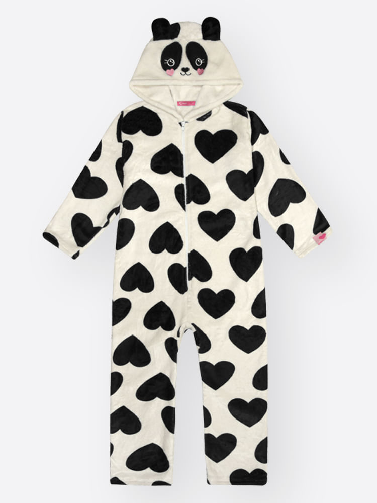 "Proporcione noites de sono mágicas e repletas de aconchego com o Macacão Pijama Infantil em Pelo Fleece, a escolha perfeita para manter os pequenos aquecidos mesmo nos dias mais frios de inverno. Este pijama macacão (ou kigurumi) une o toque ultra macio do tecido peluciado com um design lúdico e encantador. Sua estampa moderna combina o clássico contraste do Natural e Preto com delicados corações, enquanto o capuz interativo traz o rosto de um simpático panda com detalhes bordados e orelhinhas em 3D, transformando a hora de dormir em um momento de pura brincadeira.