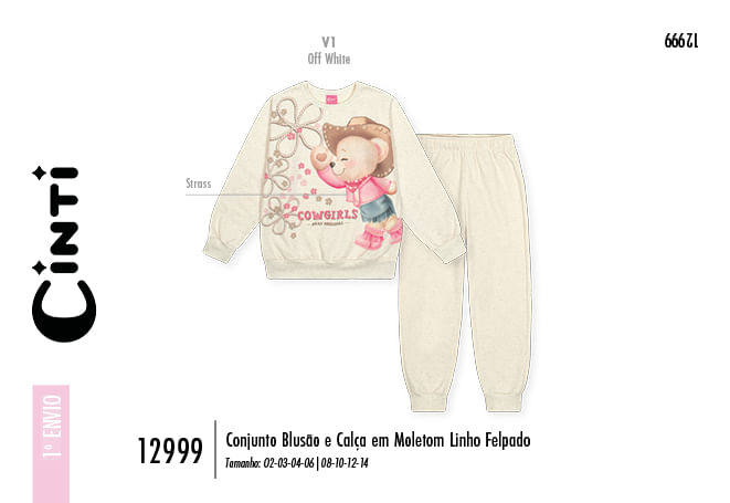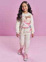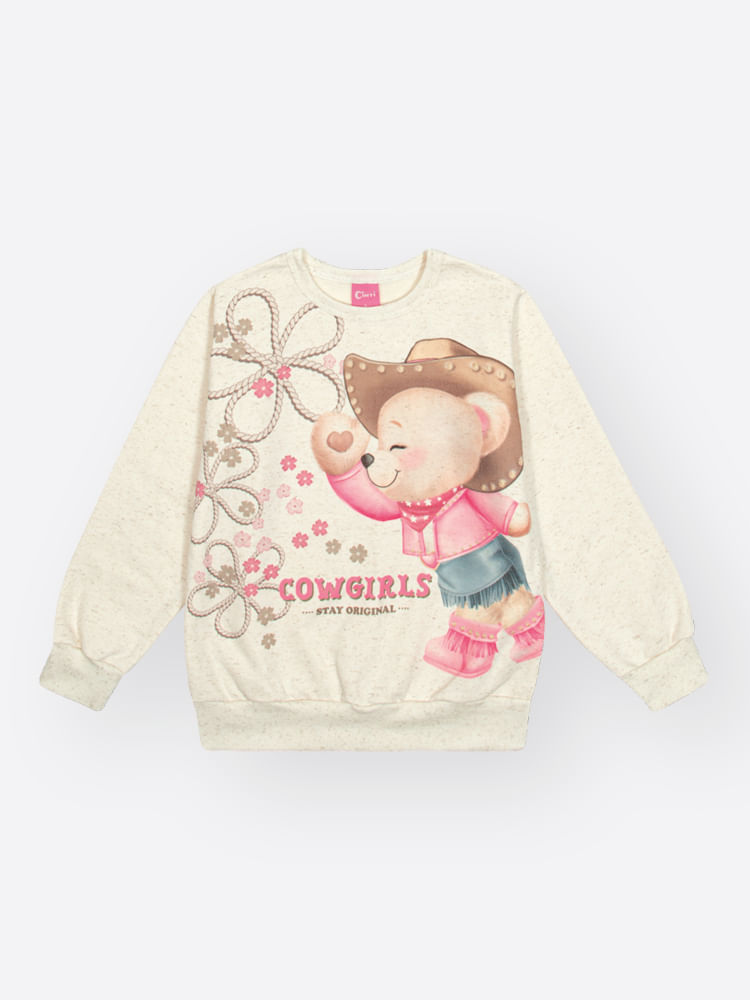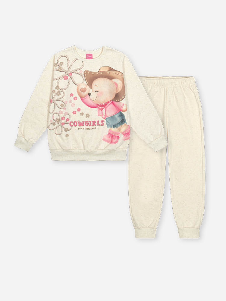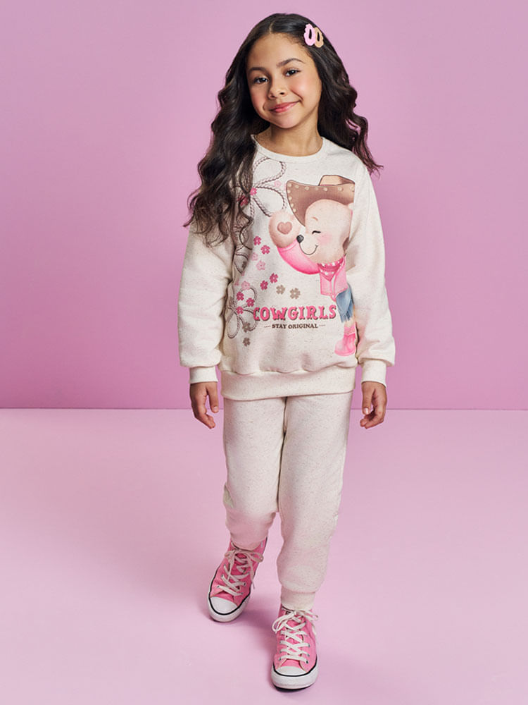 "O conjunto infantil de moletom linho felpado da Cinti é a tradução de aconchego e estilo para o guarda-roupa de inverno das meninas. Composto por um blusão clássico e uma calça no estilo jogger, este conjunto utiliza uma textura diferenciada de linho que eleva o visual básico a um nível mais sofisticado e moderno. O blusão encanta com sua estampa lúdica de uma ursinha cowgirl, trazendo elementos delicados como flores e brilhos em strass que adicionam um charme especial à peça. Para garantir o máximo conforto durante as brincadeiras, a calça possui cós com elástico rebatido e punhos talhados, que proporcionam um ajuste perfeito ao corpo sem limitar os movimentos.