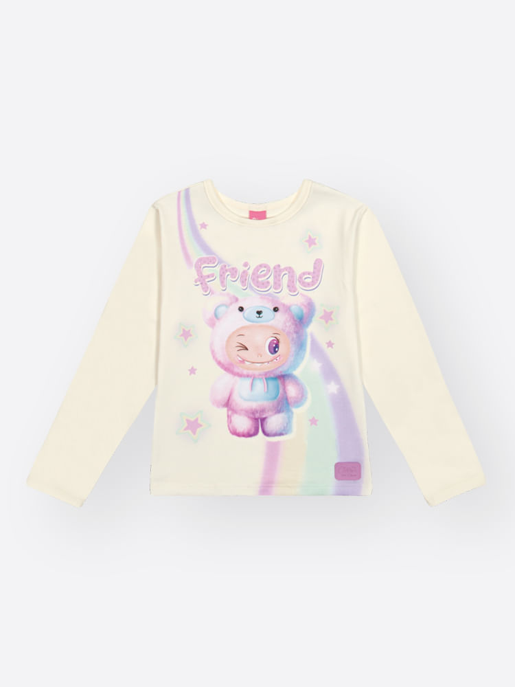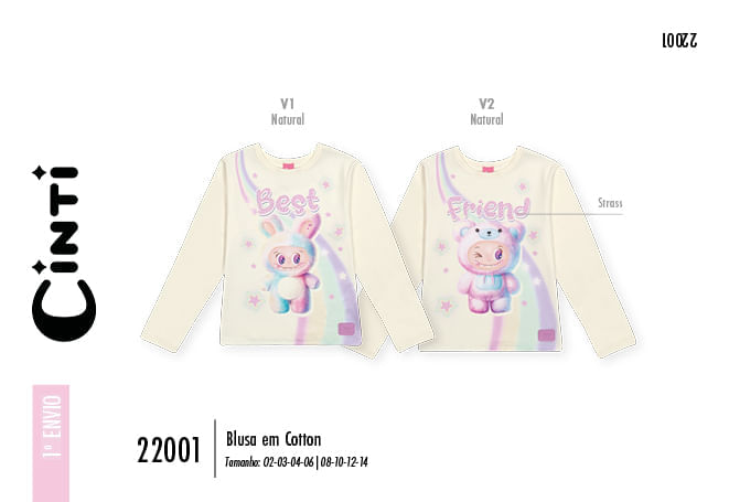 "A blusa infantil em cotton de manga longa da Cinti é aquele item essencial que combina a suavidade do algodão com um toque de magia para o dia a dia das pequenas. Pensada para oferecer máximo conforto e flexibilidade, a peça se ajusta delicadamente ao corpo, permitindo total liberdade para brincar e aprender. O grande destaque fica por conta das estampas lúdicas e interativas com a temática Best Friend, trazendo personagens fofos em tons pastéis e acabamentos brilhantes em strass, que dão um brilho especial e encantador à produção.