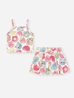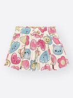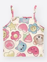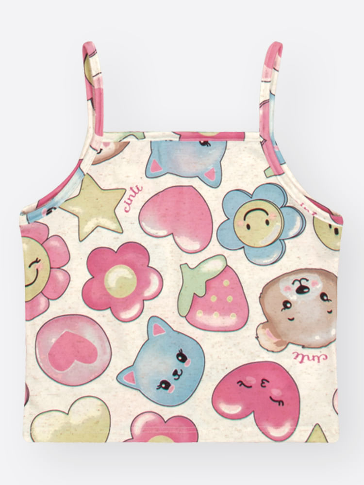 A estampa é um verdadeiro convite à imaginação, trazendo elementos adoráveis como estrelas, corações, flores sorridentes e personagens fofos de ursinho e gatinho em tons suaves. Por ser uma peça versátil e atemporal, este conjunto é perfeito para passeios ao ar livre, festas de aniversário diurnas ou uma tarde de lazer no parque. Para um look completo e cheio de estilo, combine com sandálias tipo papete, sapatilhas ou até um tênis casual branco. Nos dias mais frescos, uma jaqueta jeans sobreposta cria uma composição moderna e funcional, mantendo a essência alegre que a moda infantil pede."