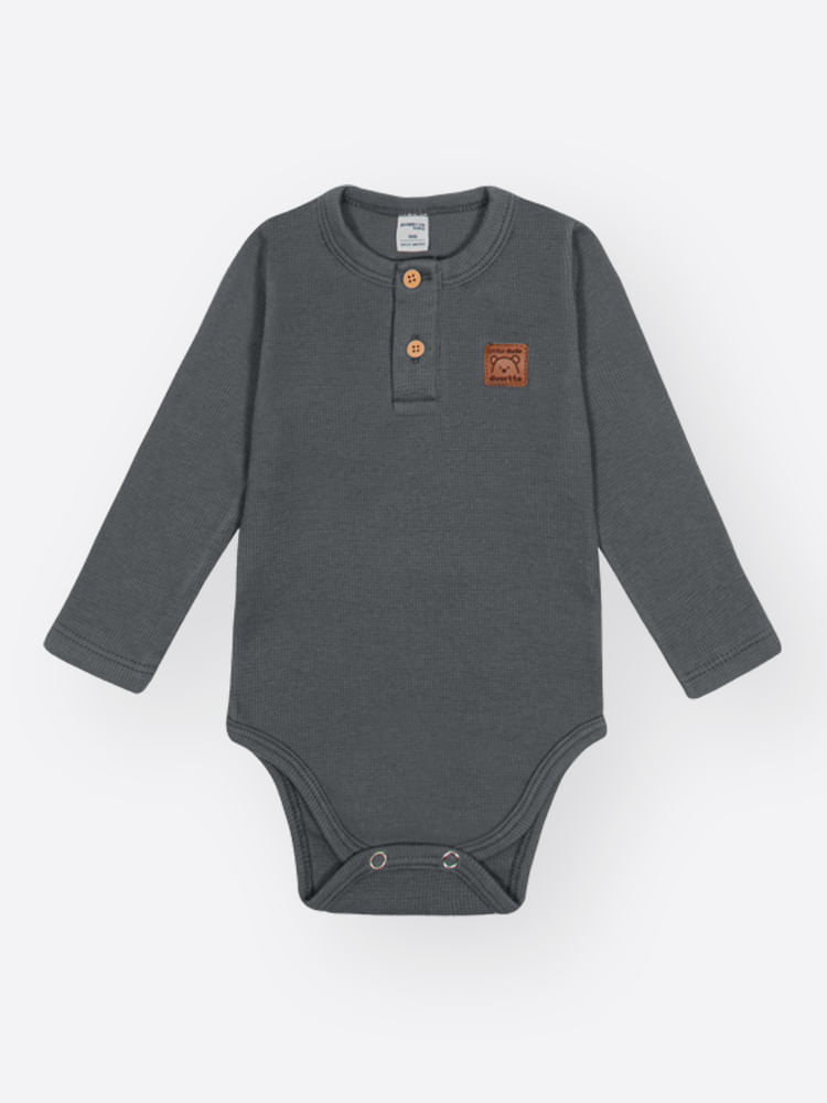 Desenvolvido para a coleção de Inverno 2026, o body é confeccionado em malha macia e de alta qualidade, garantindo total liberdade de movimento para os pequenos exploradores. O acabamento premium inclui uma delicada etiqueta decorativa de ursinho no peito, adicionando um detalhe lúdico e fofo que os pais adoram. Para facilitar a rotina, a peça conta com fechamento prático por dois botões de pressão entrepernas, agilizando o momento da troca de fraldas sem abrir mão da segurança.