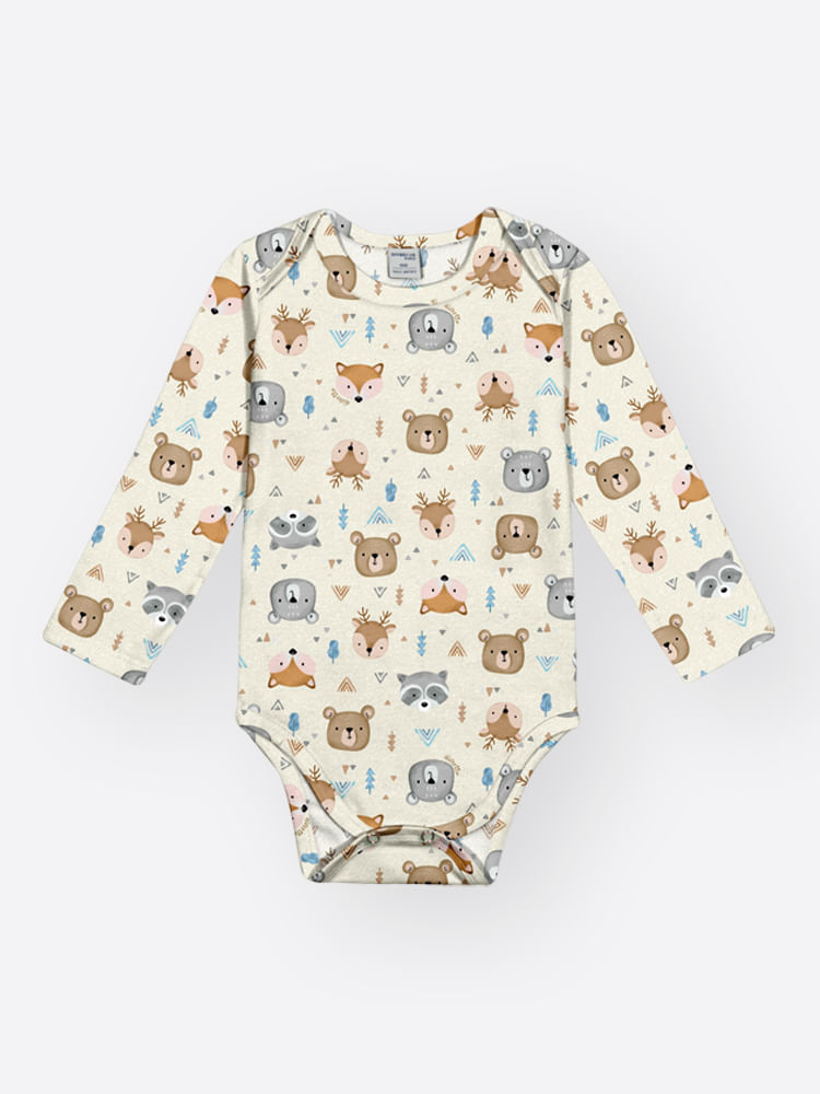 "O Body Manga Longa em Malha Suede da coleção Inverno 2026 é a escolha perfeita para abraçar o seu bebê com suavidade e estilo nos dias mais frescos. Confeccionado em um tecido com toque aveludado, ele proporciona um conforto térmico excepcional, mantendo os pequenos aconchegados durante todo o dia. A peça se destaca por sua estampa lúdica e encantadora de animais da floresta, como ursinhos, raposas e guaxinins, aplicada através de um processo de sublimação que garante cores vivas e alta durabilidade. Com foco na praticidade, o design inclui um decote com transpasse nos ombros, que facilita a passagem da cabeça, e fechamento entrepernas com dois botões de pressão em prata, tornando a rotina de trocas muito mais ágil e segura. Este body é um item essencial e extremamente versátil para o enxoval, adaptando-se a diversos momentos: - Visual Casual: Para o dia a dia e momentos de lazer, combine com calças de moletom ou leggings em tons sólidos que remetam às cores da estampa, como verde oliva ou azul marinho, criando um conjunto harmônico e confortável. - Camada de Proteção: Em dias de frio mais rigoroso, ele serve como a primeira camada ideal sob macacões de lã ou jaquetas pesadas, graças ao caimento ajustado da malha suede. - Passeios Especiais: A estampa temática de floresta traz um ar moderno e ""instagramável"", sendo uma excelente opção para ensaios fotográficos casuais ou visitas à família, garantindo que o bebê esteja sempre bem vestido e protegido"