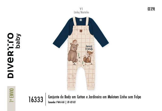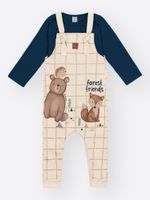 "O Conjunto de Body em Cotton e Jardineira em Moletom Linho da coleção Inverno 2026 é a escolha perfeita para quem busca um visual ""mini gentleman"" que transborda doçura e conforto. Composto por um body de toque macio e uma jardineira em moletom linho sem felpa, este conjunto oferece um caimento leve e sofisticado, ideal para manter o bebê arrumadinho sem restringir seus movimentos. O design destaca-se pela delicada sublimação em folha e pelo bordado ""Forest Friends"", que trazem a calmaria da natureza para o guarda-roupa infantil de forma lúdica. Pensando na praticidade, a jardineira conta com alças ajustáveis através de caseados e botões, enquanto o body possui abertura entrepernas com botões de pressão, garantindo trocas rápidas e um ajuste sempre impecável. Os acabamentos em punho de ribana nas pernas ajudam a manter o calorzinho e dão um toque moderno à peça.