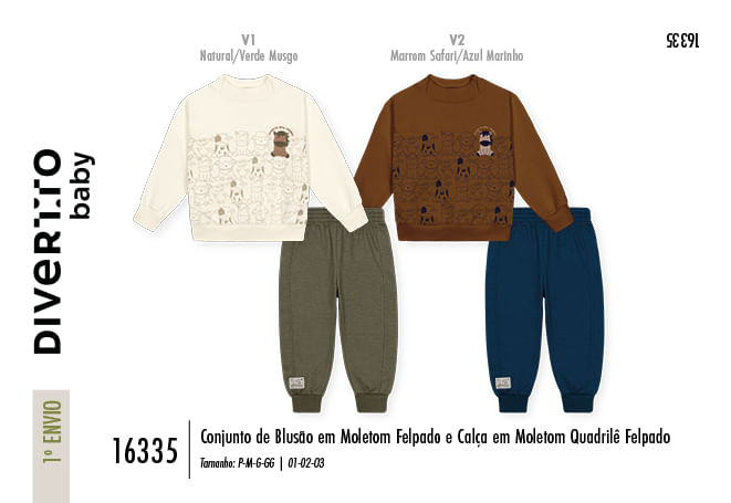 "O Conjunto de Blusão e Calça em Moletom Felpado da coleção Inverno 2026 é a escolha definitiva para garantir que o seu pequeno aproveite os dias frios com o máximo de aconchego e estilo. Este conjunto foi desenvolvido com foco no conforto térmico, unindo um blusão em moletom macio a uma calça em moletom quadrile felpado, que oferece uma textura encorpada e extremamente quente para proteger contra as baixas temperaturas. O design do blusão destaca-se pela gola em ribana com transpasse, que facilita o vestir sem incomodar o bebê, e uma estampa frontal lúdica que traz a alegria da estação para o visual. A calça apresenta um corte moderno com traseiro vindo para a frente e pespontos diferenciados, garantindo um ajuste anatômico e liberdade total para engatinhar ou brincar. Detalhes como a etiqueta decorativa de ovelhinha em tafetá e os acabamentos em punhos e barra de ribana reforçam o cuidado e a delicadeza característicos da marca.