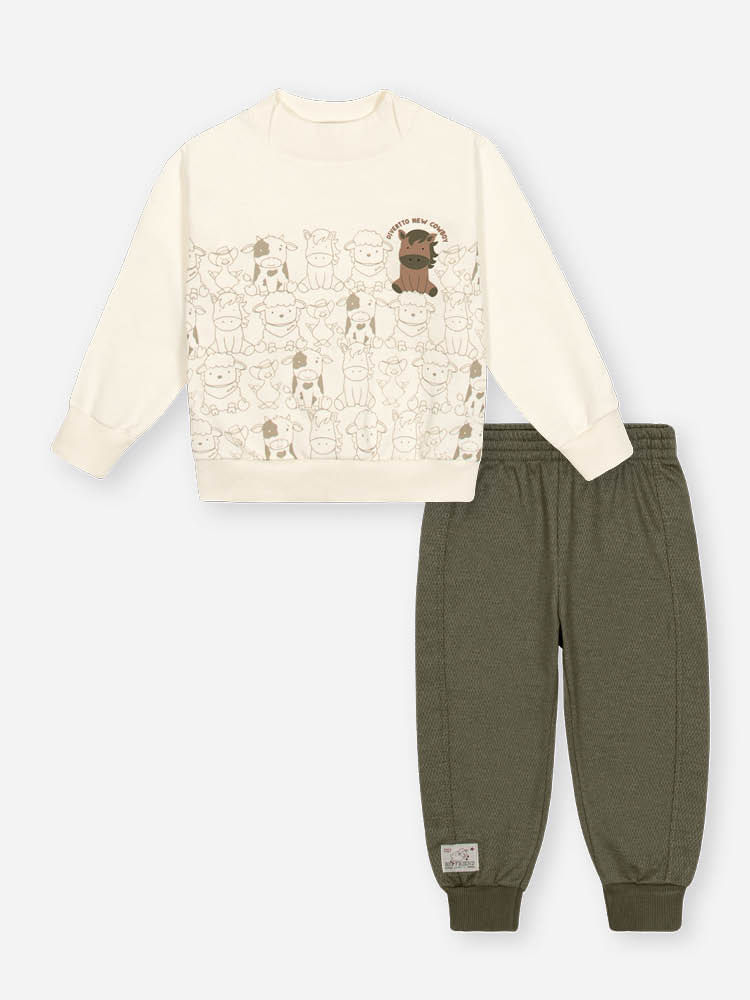 "O Conjunto de Blusão e Calça em Moletom Felpado da coleção Inverno 2026 é a escolha definitiva para garantir que o seu pequeno aproveite os dias frios com o máximo de aconchego e estilo. Este conjunto foi desenvolvido com foco no conforto térmico, unindo um blusão em moletom macio a uma calça em moletom quadrile felpado, que oferece uma textura encorpada e extremamente quente para proteger contra as baixas temperaturas. O design do blusão destaca-se pela gola em ribana com transpasse, que facilita o vestir sem incomodar o bebê, e uma estampa frontal lúdica que traz a alegria da estação para o visual. A calça apresenta um corte moderno com traseiro vindo para a frente e pespontos diferenciados, garantindo um ajuste anatômico e liberdade total para engatinhar ou brincar. Detalhes como a etiqueta decorativa de ovelhinha em tafetá e os acabamentos em punhos e barra de ribana reforçam o cuidado e a delicadeza característicos da marca.