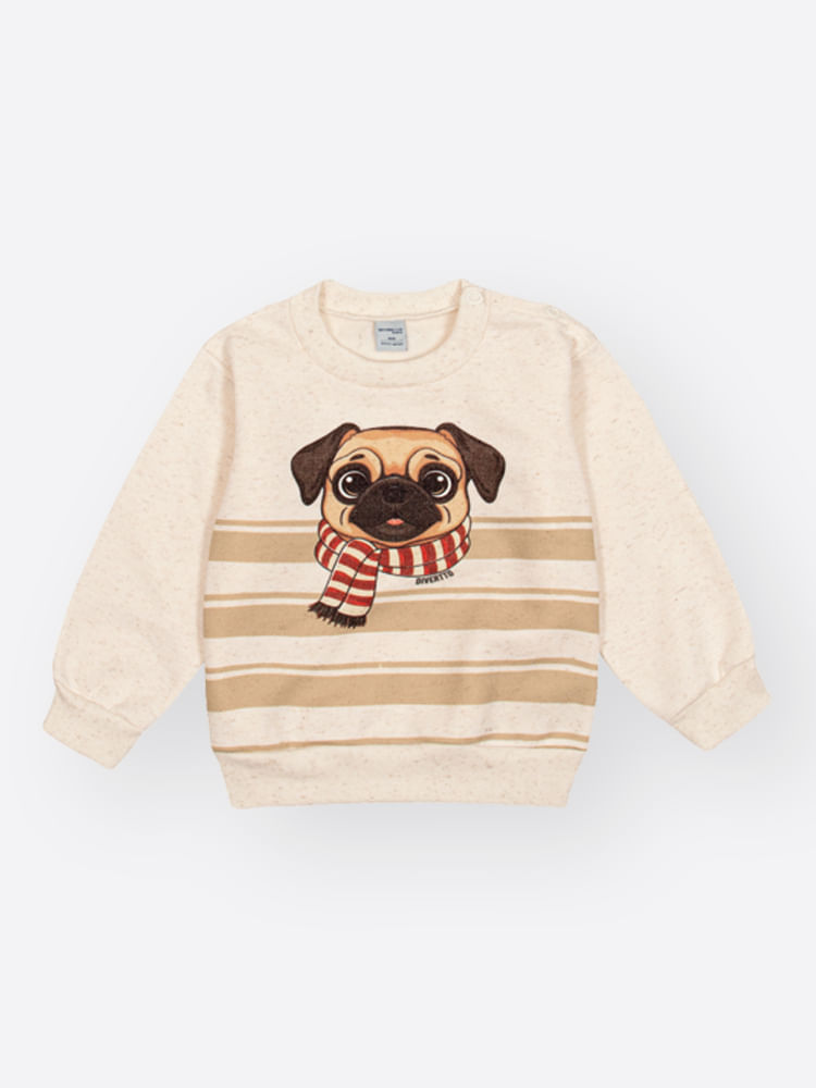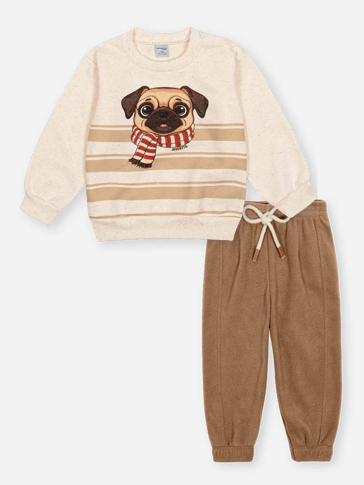 "O Conjunto de Blusão em Moletom Linho Felpado e Calça em Soft da coleção Inverno 2026 é a escolha ideal para os pais que buscam unir a estética refinada do linho com o aquecimento máximo necessário para os dias de frio intenso. O blusão é confeccionado em moletom linho com interior peluciado, garantindo um toque macio e térmico, enquanto a calça em tecido Soft oferece uma camada extra de proteção e aconchego, mantendo o bebê aquecido de forma leve e confortável. O visual se destaca pela sublimação frontal em folha, que traz um ar de serenidade e natureza, complementada por uma etiqueta decorativa ""Dog Authentic"", adicionando um detalhe lúdico e sofisticado à peça. Pensando na praticidade, o blusão conta com abertura no ombro com botões de pressão, facilitando o vestir, e a calça possui cós rebatido com elástico e um charmoso cadarço com ponteiras em courinho, garantindo um ajuste perfeito sem apertar a barriguinha do bebê.