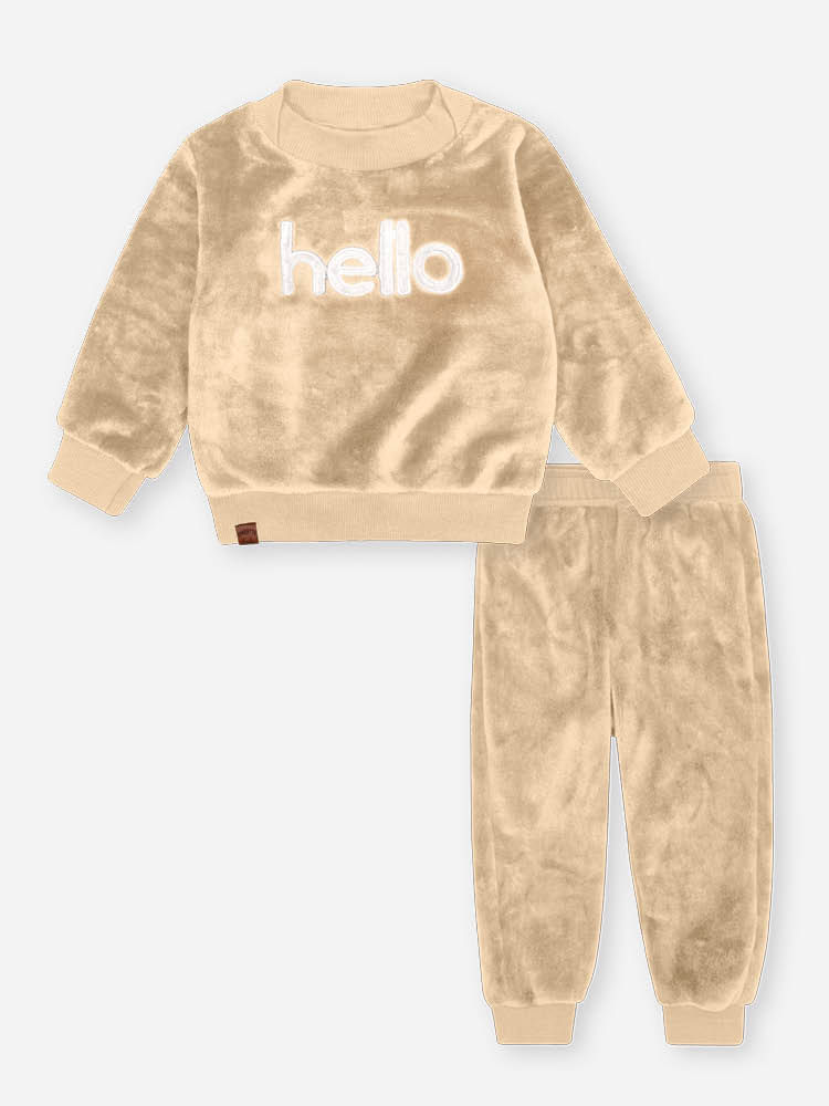 "O Conjunto de Blusão e Calça em Fleece da coleção Inverno 2026 é o verdadeiro abraço em forma de roupa, projetado para manter os bebês aquecidos com a leveza e a maciez que a estação pede. Confeccionado em tecido fleece de alta qualidade, este conjunto possui propriedades térmicas excelentes, sendo ideal para enfrentar as baixas temperaturas sem pesar no corpo do pequeno, garantindo total liberdade para engatinhar e brincar. O design ganha um toque encantador e lúdico com o bordado em pelo ""Hello"", que traz uma textura sensorial fofa e amigável ao blusão. Pensando na praticidade e no conforto absoluto, o modelo conta com uma gola com transpasse em ribana, que facilita o vestir sem incomodar o bebê, além de punhos, barra e cós em ribana que vedam a entrada do frio de forma gentil. O acabamento premium é assinado com uma delicada etiqueta de courinho ""Divertto Clip Baby"", reforçando o cuidado em cada detalhe desta peça feita para durar.