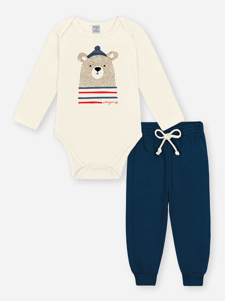 "O Conjunto de Body em Cotton e Calça em Moletom da coleção Inverno 2026 é o duo indispensável para garantir o máximo de conforto e praticidade na rotina dos bebês. O body, confeccionado em cotton macio e respirável, apresenta uma estampa localizada com o moderno efeito puff, que adiciona um relevo emborrachado e divertido à peça, estimulando a curiosidade visual dos pequenos. Para facilitar a vida dos pais, possui abertura estratégica entrepernas com botões de pressão, tornando a troca de fraldas muito mais rápida. A calça em moletom sem felpa é ideal para garantir liberdade total de movimentos, destacando-se pelo design contemporâneo com a lateral vinda para a frente e pespontos detalhados. O ajuste é perfeito e gentil graças ao cós elástico rebatido com cadarço decorativo em nó e aos punhos em ribana, que mantêm a peça no lugar enquanto o bebê descobre o mundo.