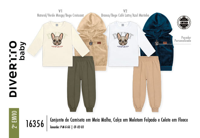 "O Conjunto de Camiseta em Meia Malha, Calça em Moletom Felpado e Colete em Fleece da coleção Inverno 2026 é o trio definitivo para garantir proteção térmica e versatilidade ao guarda-roupa do bebê. Este conjunto inteligente une a leveza da camiseta em meia malha, que apresenta uma estampa frontal lúdica, ao calor aconchegante da calça em moletom felpado, que se destaca pelo detalhe moderno de uma nervura em cada perna e punhos em ribana para manter o calor. O grande protagonista do look é o colete em fleece, uma terceira camada leve e extremamente macia que conta com fechamento por zíper de nylon com protetor e um detalhe encantador: um chaveiro divertido pregado no puxador, que traz um toque de interatividade para o pequeno. Com abertura no ombro por botões de pressão na camiseta e cós elástico rebatido na calça, este conjunto foi desenhado para oferecer praticidade máxima aos pais e conforto absoluto para o bebê explorar o mundo.