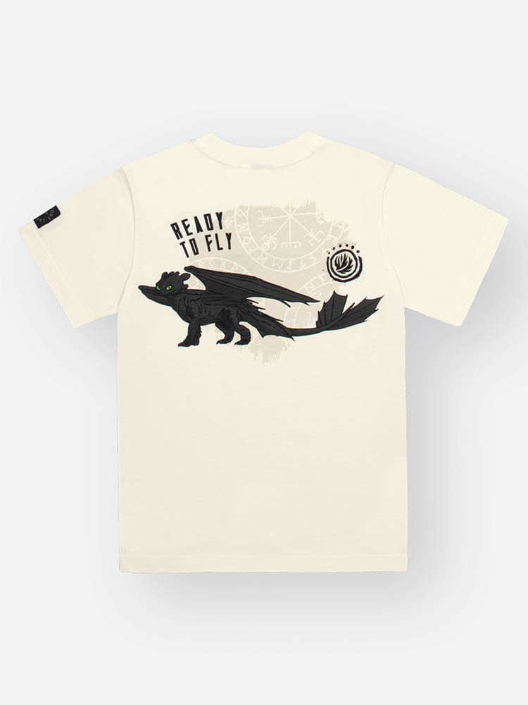 O design se destaca pelo minimalismo sofisticado na parte frontal, trazendo a logo icônica da franquia de forma discreta no peito e um detalhe exclusivo de etiqueta na manga. Já as costas revelam uma estampa de impacto com o personagem Banguela, acompanhado da frase ""Ready to Fly"" e elementos gráficos que remetem a mapas vikings, conferindo um ar moderno e autêntico ao visual.