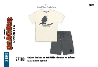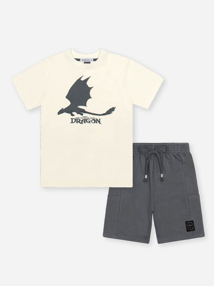 "Este conjunto da Divertto é o equilíbrio perfeito entre a sofisticação moderna e o espírito aventureiro da moda infantil. Composto por uma camiseta em meia malha de toque suave e uma bermuda em moletom de alta qualidade, o duo prioriza o conforto sem abrir mão de um design estruturado. A estampa central, inspirada na franquia ""Como Treinar o Seu Dragão"", traz a silhueta icônica do personagem Banguela em uma abordagem minimalista e estilizada, conferindo um ar geek-chic à produção.