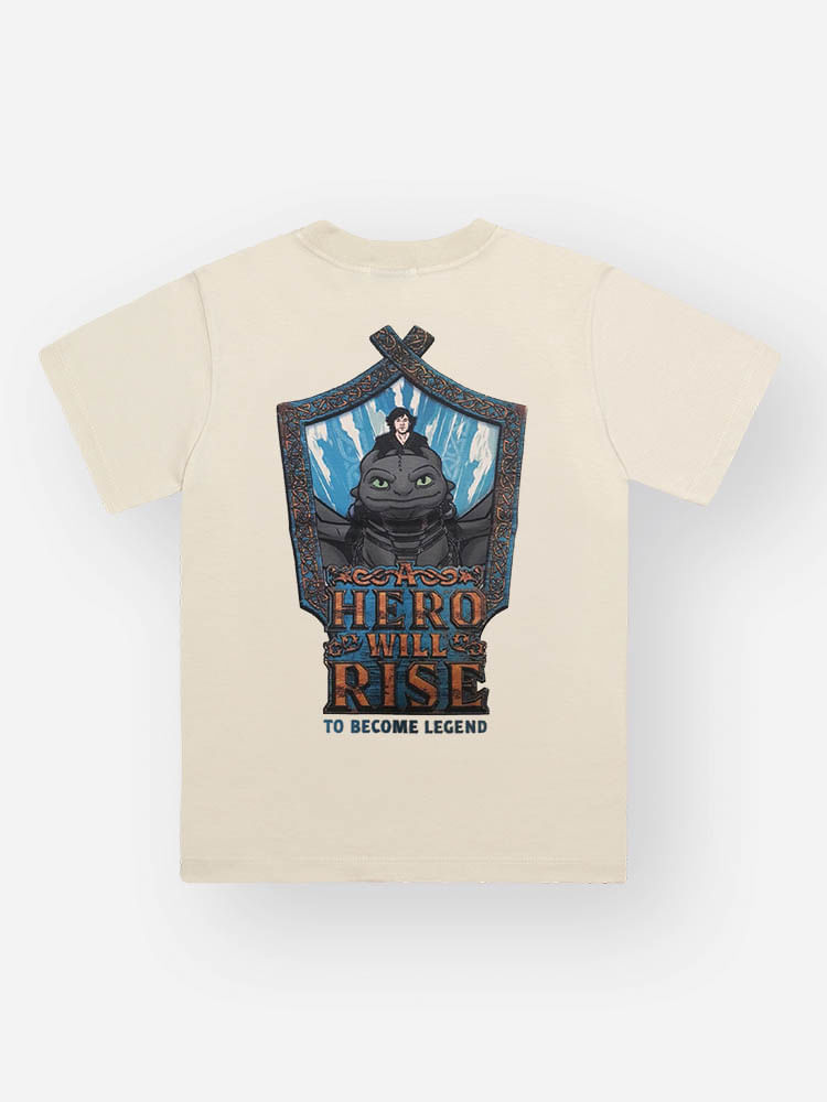 O design se destaca pelas estampas exclusivas: a camiseta apresenta um detalhe frontal minimalista com uma espada e a frase ""Hero Will Rise"", enquanto as costas revelam uma arte imponente com o personagem Banguela em um escudo nórdico, reforçando a estética épica da peça. A bermuda em moletom complementa o visual com um ajuste perfeito via cordão regulador e acabamento premium.