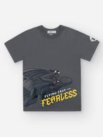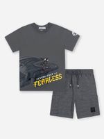 A camiseta, confeccionada em meia malha, garante um toque macio e alta respirabilidade, essencial para o bem-estar dos pequenos. O destaque fica para a estampa frontal localizada, que traz os personagens icônicos em uma arte dinâmica com a frase ""Flying Fast and Fearless"", evocando um espírito destemido e aventureiro. Complementando o visual, a bermuda em moletom molinê oferece uma textura diferenciada e sofisticada, com caimento impecável, cós elástico e cordão funcional para um ajuste preciso.