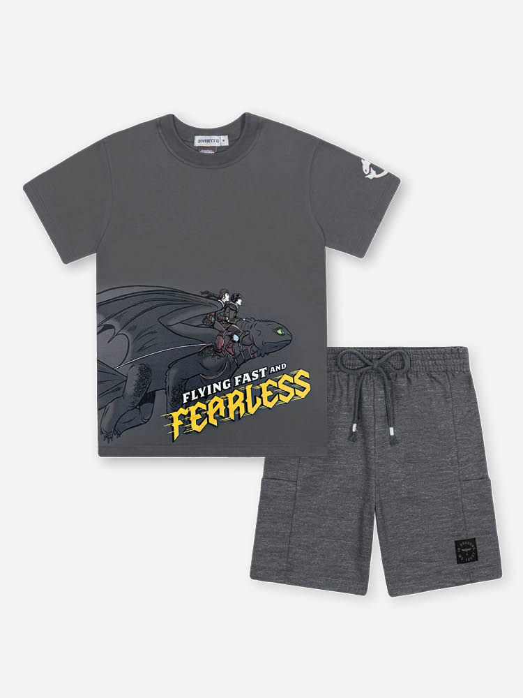 "Prepare-se para grandes aventuras com o Conjunto Infantil Masculino Divertto, uma escolha que une o universo fantástico de ""Como Treinar o Seu Dragão"" ao máximo conforto do streetwear mirim. Este conjunto é ideal para pais que buscam durabilidade e estilo em uma única proposta.
