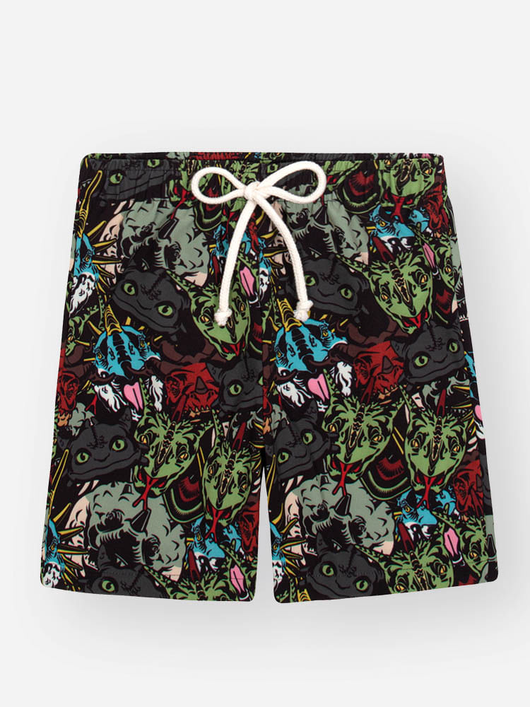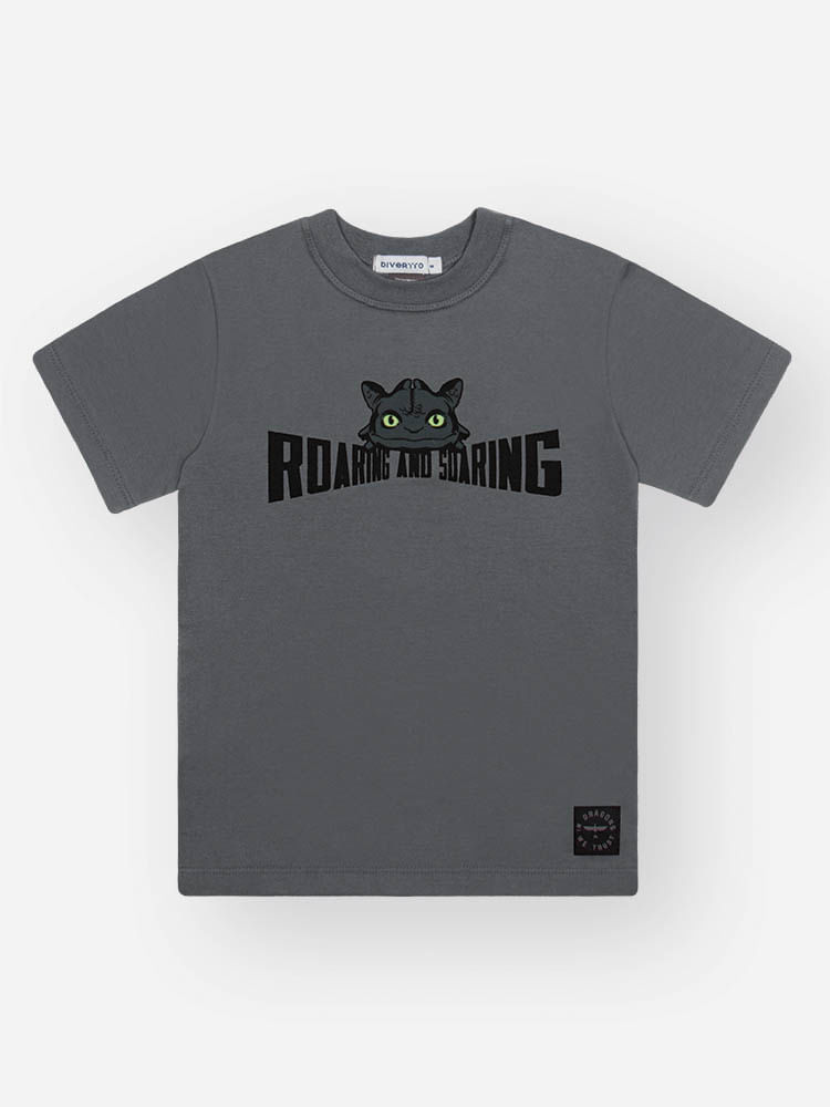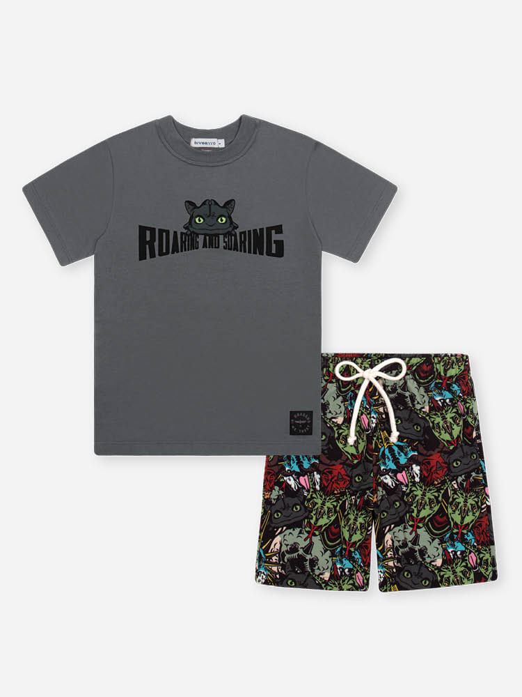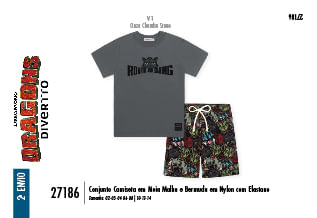 A camiseta, confeccionada em meia malha, proporciona um toque suave à pele e excelente respirabilidade. Ela se destaca por estampas que celebram a jornada dos dragões: em um modelo, uma estampa frontal com efeito 3D e um detalhado gráfico circular nas costas que representa as diferentes classes de dragões; em outro, uma estampa centralizada com o icônico Banguela acompanhado da frase ""Roaring and Soaring"". A bermuda, disponível tanto em moletom quanto em nylon com elastano, garante total liberdade de movimentos. Enquanto a versão em moletom aposta em um visual utilitário com bolso lateral cargo e cordão funcional, a versão em nylon apresenta uma estampa all-over vibrante com diversos personagens, trazendo energia extra ao visual.