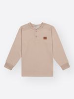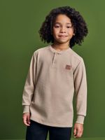 O modelo apresenta uma gola em ribana com acabamento impecável e um recorte estratégico em malha lisa nos ombros, reforçado por pespontos que garantem durabilidade para todas as brincadeiras. O fechamento frontal em estilo henley conta com botões de madeira, conferindo um toque rústico e moderno.