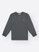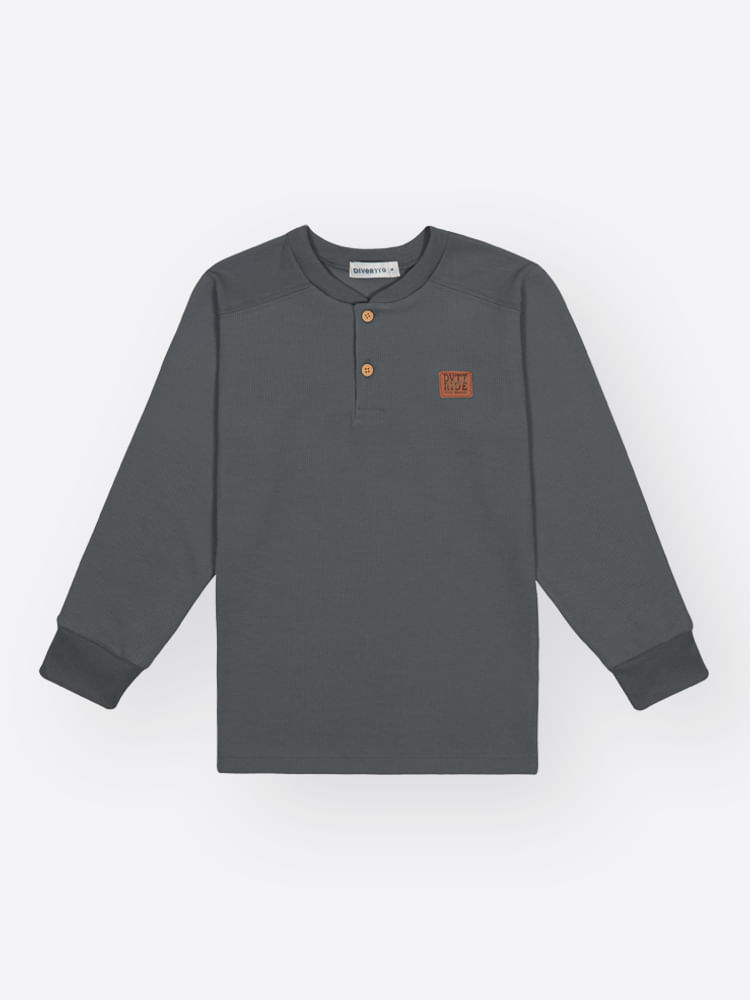 O modelo apresenta uma gola em ribana com acabamento impecável e um recorte estratégico em malha lisa nos ombros, reforçado por pespontos que garantem durabilidade para todas as brincadeiras. O fechamento frontal em estilo henley conta com botões de madeira, conferindo um toque rústico e moderno.