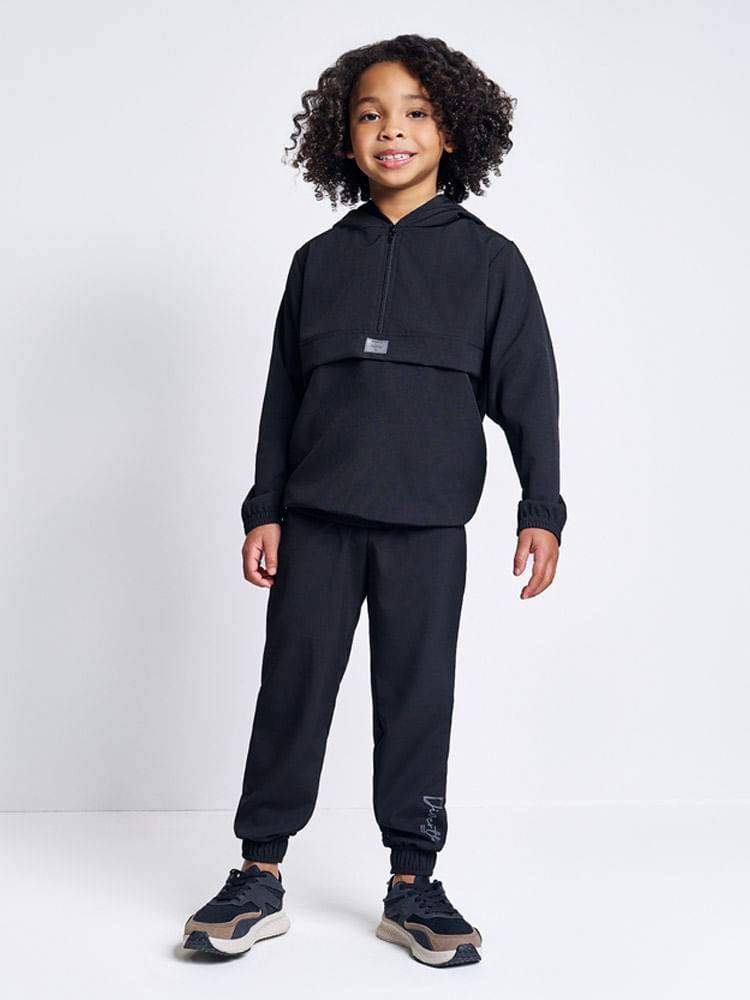 Confeccionado em tecido técnico de nylon com elastano, o conjunto oferece liberdade total de movimentos e resistência, ideal para acompanhar o ritmo dinâmico das crianças. O blusão apresenta um design moderno com fechamento em zíper, facilitando o vestir, e acabamentos em elástico rebatido que garantem um ajuste impecável ao corpo, mantendo o aquecimento interno. A calça modelo jogger reforça a estética urbana e esportiva, contando com cós elástico e cordão decorativo com acabamento em nó, proporcionando máxima praticidade e segurança.