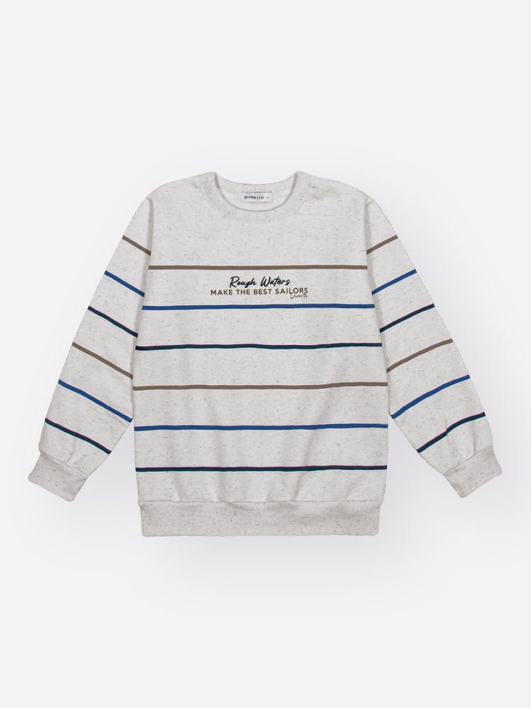 O design é marcado por uma estampa listrada clássica que percorre todo o corpo e mangas, conferindo uma estética aventureira e atemporal. No centro, o destaque fica para a estampa com efeito puff, que adiciona relevo e uma textura moderna à escrita inspiracional. Com acabamentos de alta qualidade, a peça possui friso, punhos e barra em ribana, que garantem o ajuste perfeito ao corpo e maior durabilidade.
