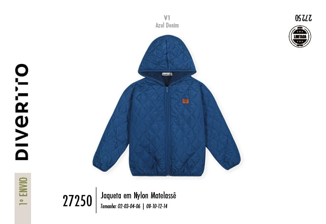 "Esta jaqueta da Divertto é a escolha ideal para pequenos exploradores que não abrem mão do estilo, mesmo nos dias mais gelados. Confeccionada em nylon matelassê, ela apresenta um clássico padrão de costura em losangos (quilting), que além de conferir um visual sofisticado e atemporal, garante uma estrutura acolchoada resistente para as maiores aventuras ao ar livre.