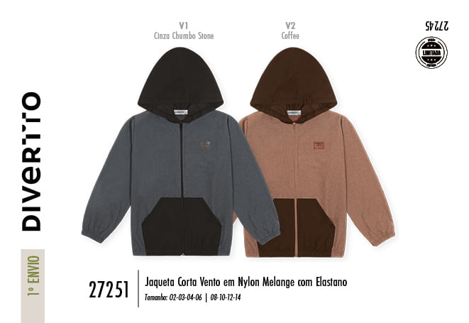 "Esta Jaqueta Corta-Vento Divertto é a escolha definitiva para pequenos aventureiros que não param nem nos dias mais frescos. Confeccionada em Nylon Melange com Elastano, a peça une a resistência necessária para as brincadeiras ao ar livre com a flexibilidade que garante total liberdade de movimento. Com um design moderno e funcional, ela apresenta um sofisticado contraste de texturas e cores sólidas: enquanto o corpo exibe o efeito mesclado (melange), o capuz e o bolso estilo canguru surgem em tons lisos, conferindo um visual dinâmico e urbano.