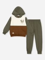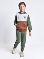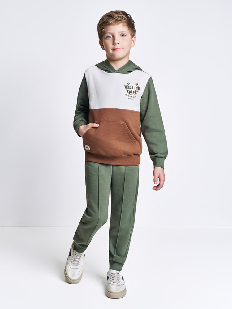 Confeccionado em moletom com pelúcia, o conjunto oferece um toque extremamente macio e isolamento térmico eficiente para os dias mais gelados. O blusão conta com um design moderno em blocos de cores, apresentando um capuz funcional e o clássico bolso canguru, perfeito para aquecer as mãos ou guardar pequenos tesouros de aventura. A calça modelo jogger complementa o look com praticidade, trazendo cós elástico rebatido e um detalhe de nervura frontal que eleva o design da peça, além de punhos em ribana que garantem um ajuste seguro.