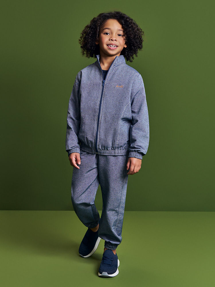 Confeccionado em tecido plano, o conjunto alia durabilidade e um toque sofisticado, ideal para acompanhar o ritmo dinâmico das crianças. A jaqueta apresenta um design moderno com gola alta e fechamento em zíper, garantindo proteção térmica sem abrir mão da elegância. O destaque fica por conta da textura mesclada sutil do tecido, que confere um aspecto visual rico e contemporâneo, fugindo do óbvio e trazendo um ar de exclusividade à peça.
