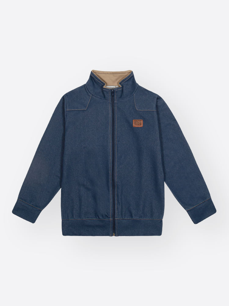 O conjunto é composto por uma jaqueta em molecotton denim com elastano, que proporciona o toque macio do moletom com a estética moderna do jeans, garantindo que a criança se movimente sem restrições. A peça apresenta uma gola alta estruturada com parte interna em moletom, recortes sobrepostos nos ombros e um acabamento refinado com etiquetas decorativas que reforçam a identidade premium da marca.