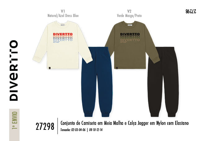 Este conjunto exclusivo da coleção Inverno 2026 é composto por uma camiseta de manga longa em meia malha, que garante um toque macio e respirável sobre a pele, e uma calça jogger em nylon com elastano, oferecendo a elasticidade e resistência ideais para garantir total liberdade de movimento. O design se destaca pela estampa frontal moderna com a logo Divertto, que recebe um acabamento especial em detalhe puff, conferindo um relevo tátil e visual que agrega personalidade imediata ao look.