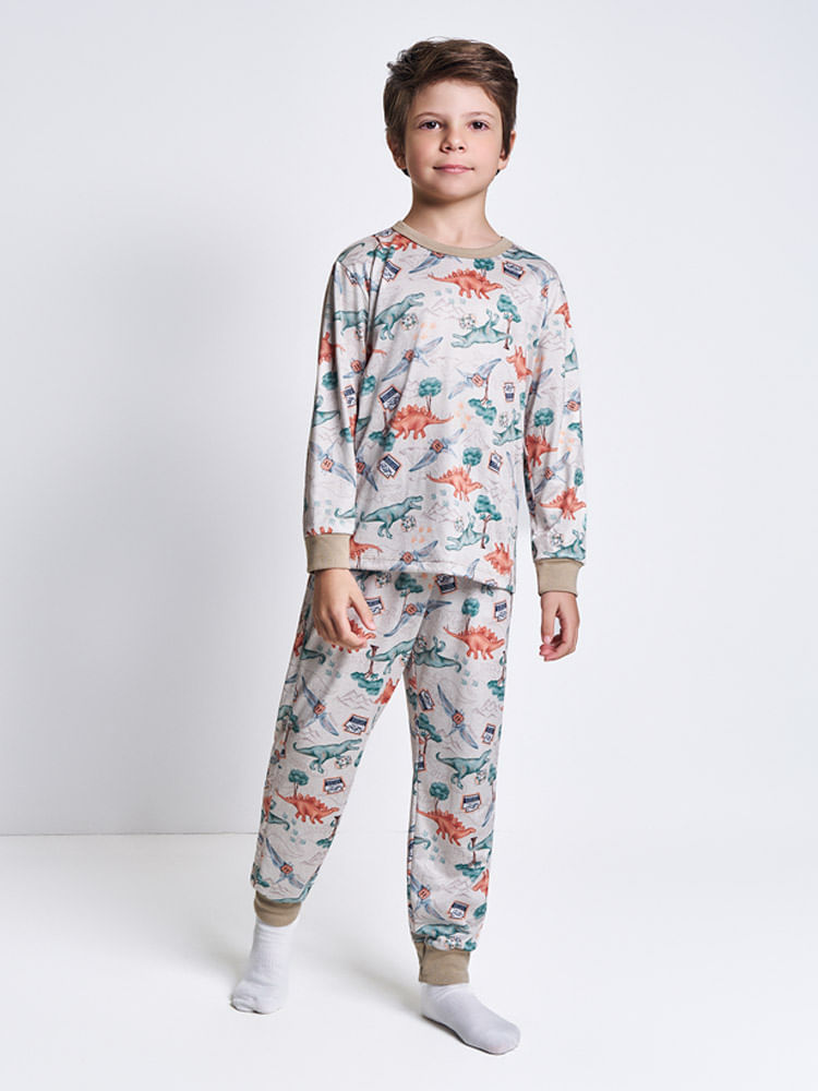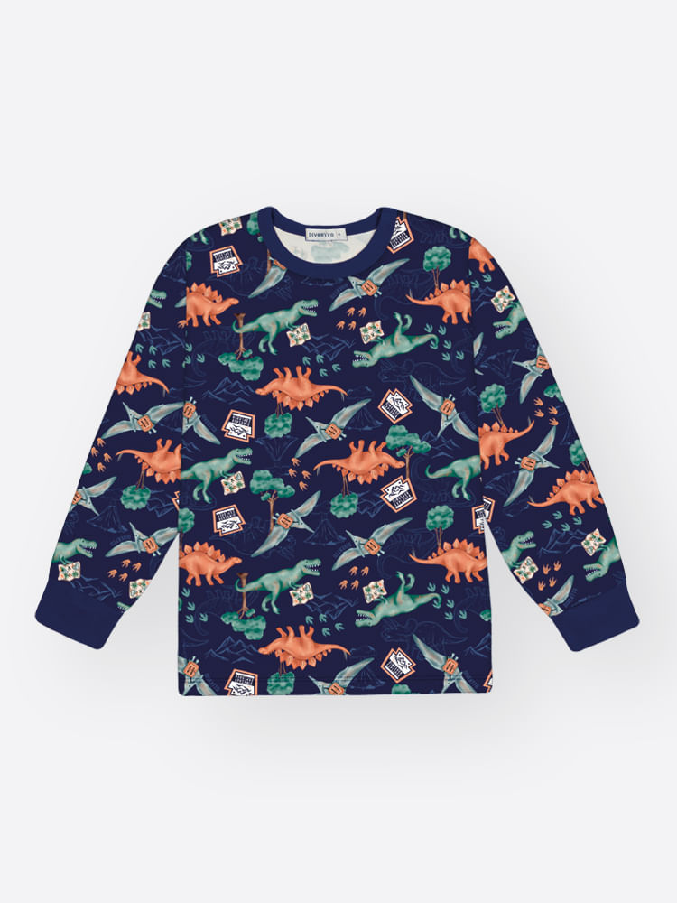 A peça destaca-se por sua estampa sublimada de alta qualidade, que apresenta um cenário lúdico e sofisticado de dinossauros e elementos da natureza. O visual remete a uma expedição pré-histórica, estimulando a imaginação das crianças de forma elegante e divertida, sem perder a sofisticação que a Divertto propõe em suas peças.