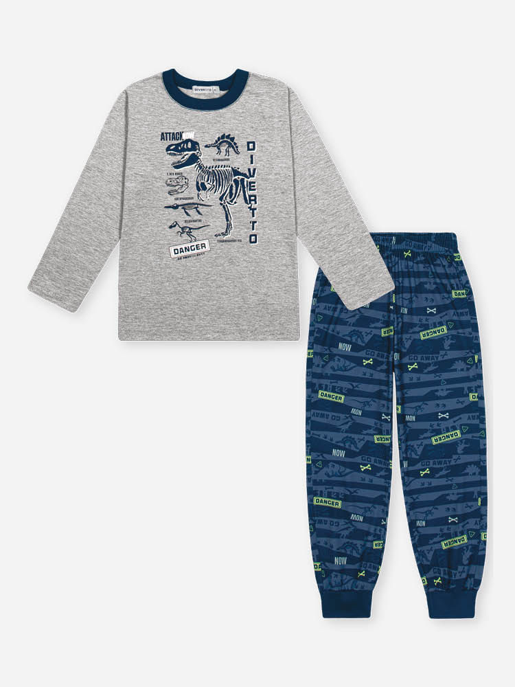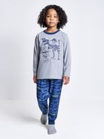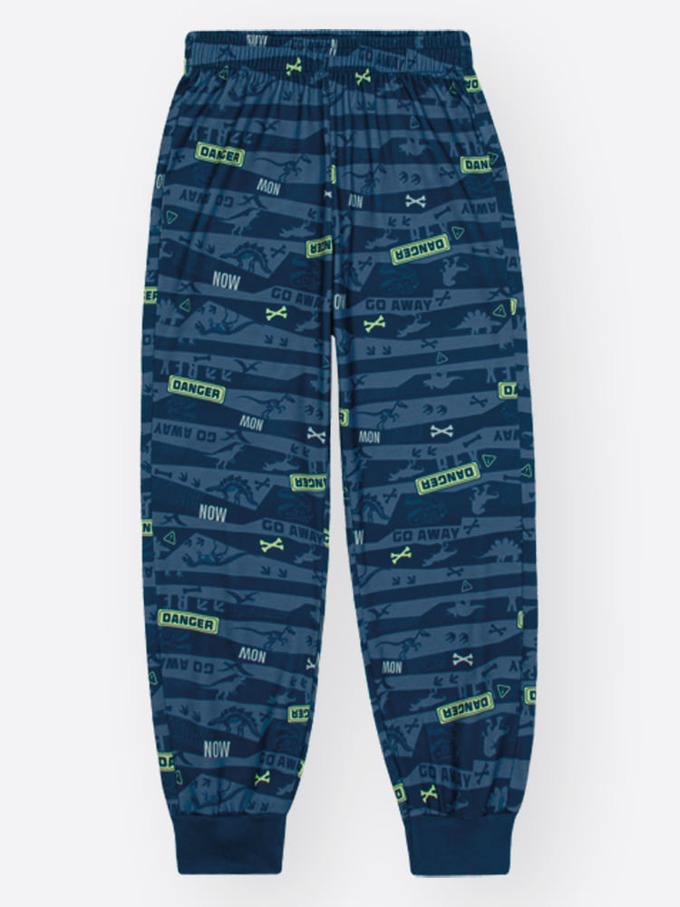 O grande diferencial deste conjunto está em sua temática de expedição pré-histórica. A camiseta apresenta uma estampa frontal em quadro com o esqueleto de um dinossauro e elementos gráficos que remetem à aventura. O toque de magia fica por conta do selo que brilha no escuro, transformando a hora de dormir em um momento lúdico e empolgante. A calça complementa o visual com uma estampa sublimada rotativa que traz padronagens modernas e dinâmicas.