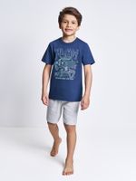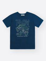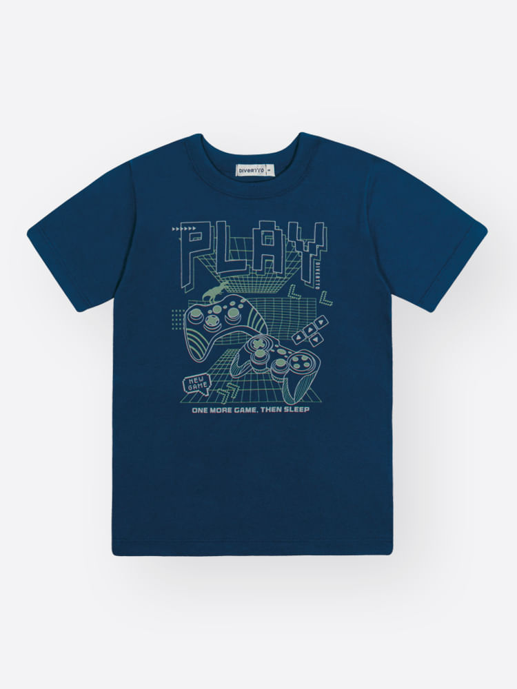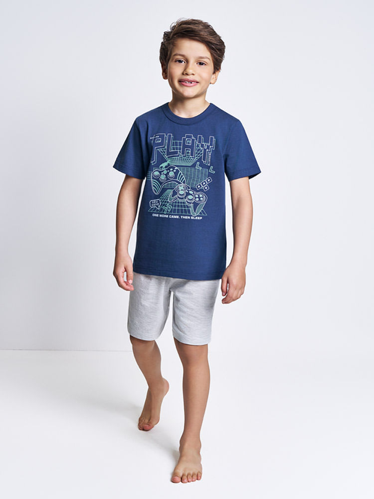 O design é um convite à aventura no universo dos jogos. A camiseta apresenta uma estampa em quadro com temática ""Play"", incorporando elementos gráficos de controles de videogame e referências tecnológicas. É o visual perfeito para os meninos que não abrem mão da sua identidade aventureira mesmo na hora de descansar.