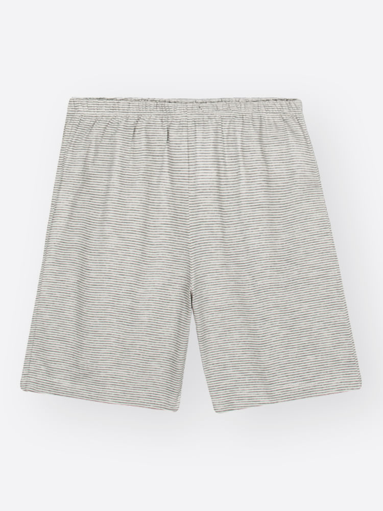 O conjunto é confeccionado em meia malha de alta qualidade, proporcionando respirabilidade e um ajuste extremamente confortável ao corpo. Composto por uma camiseta de mangas curtas e uma bermuda em malha listrada fio tinto, o modelo oferece durabilidade e um acabamento sofisticado que mantém a aparência de novo por muito mais tempo.