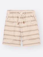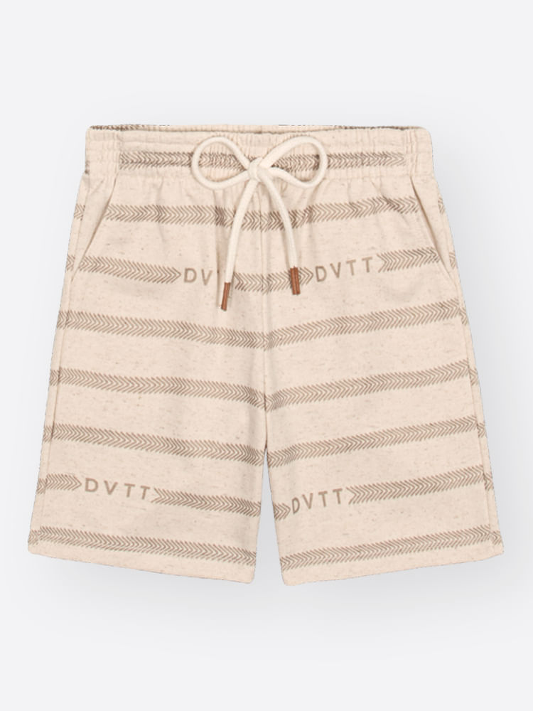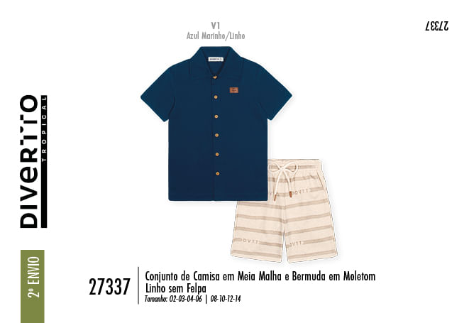 A parte superior apresenta uma camisa em meia malha com gola estruturada, ombros levemente caídos e fechamento frontal por botões de madeira, que conferem um charme rústico e natural à peça. Para compor o visual com máxima maciez, a bermuda é confeccionada em moletom linho sem felpa, proporcionando uma textura leve e respirável. O design é enriquecido por uma estampa listrada clássica na bermuda, que inclui a logomarca da Divertto de forma sutil e moderna, reforçando a identidade aventureira e exclusiva da marca.