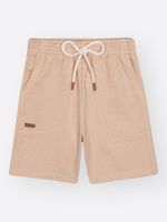 Detalhes de Estilo: A bermuda conta com um cadarço com ponteiras em courino e etiquetas decorativas estrategicamente aplicadas, reforçando o cuidado com o acabamento.