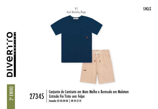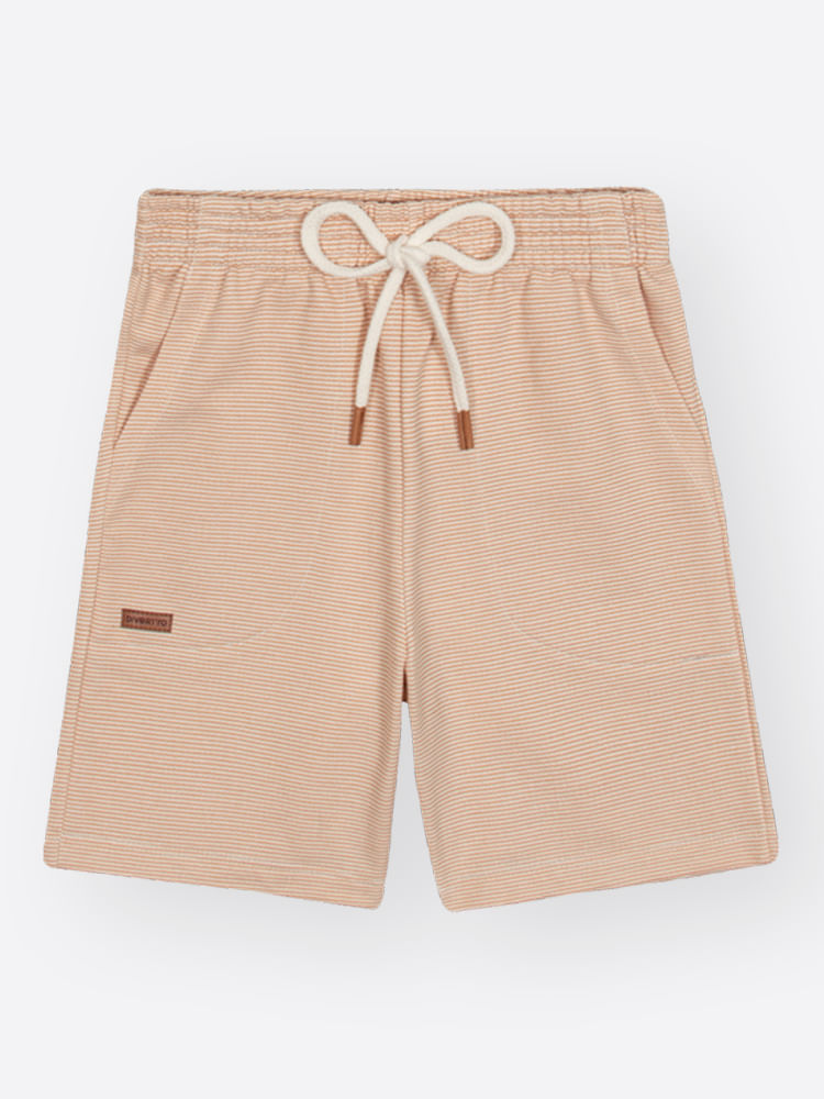A parte superior apresenta uma camiseta em meia malha, que oferece um toque macio e respirável, essencial para manter a liberdade de movimentos. O design é elevado por detalhes funcionais, como o bolso com prega tombada, que adiciona uma estética moderna e aventureira à peça. Para completar, a bermuda é confeccionada em moletom listrado sem felpa, entregando um visual clássico e atemporal com a leveza necessária para os dias de diversão. O conjunto foca em texturas e padronagens sutis, utilizando a estampa listrada da própria malha para criar um contraste elegante e sofisticado.