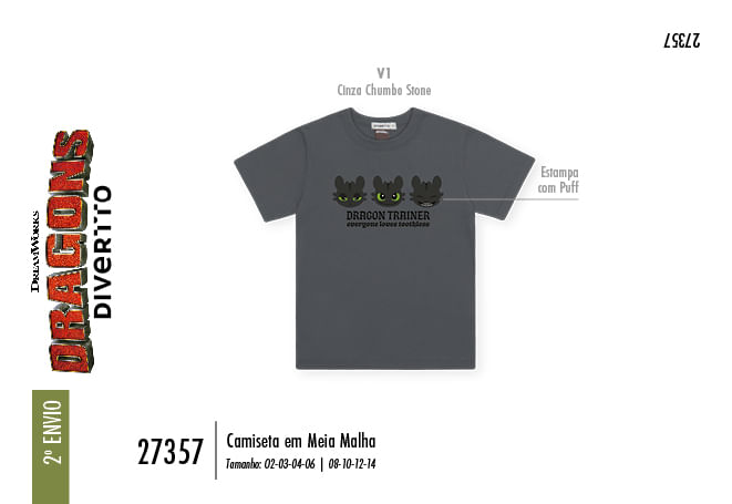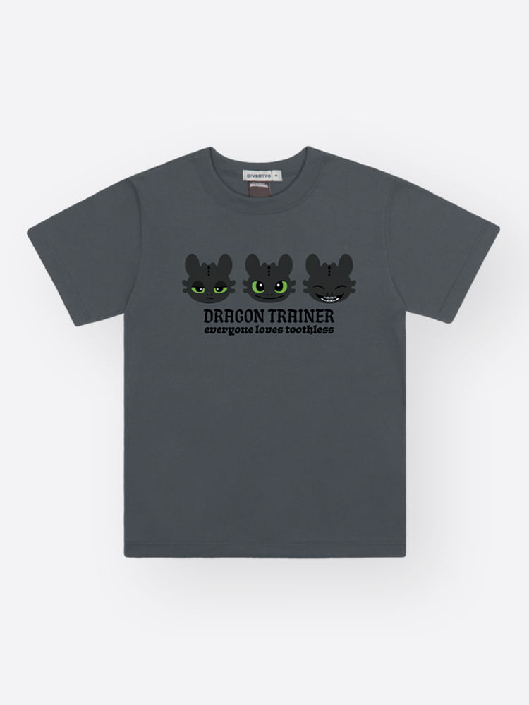 O grande destaque fica por conta da estampa frontal localizada, que traz o icônico Banguela em diferentes expressões, acompanhado da frase ""Dragon Trainer"". O diferencial está no acabamento em puff, que confere um relevo moderno e uma experiência tátil divertida à estampa, tornando o visual muito mais dinâmico e autêntico.