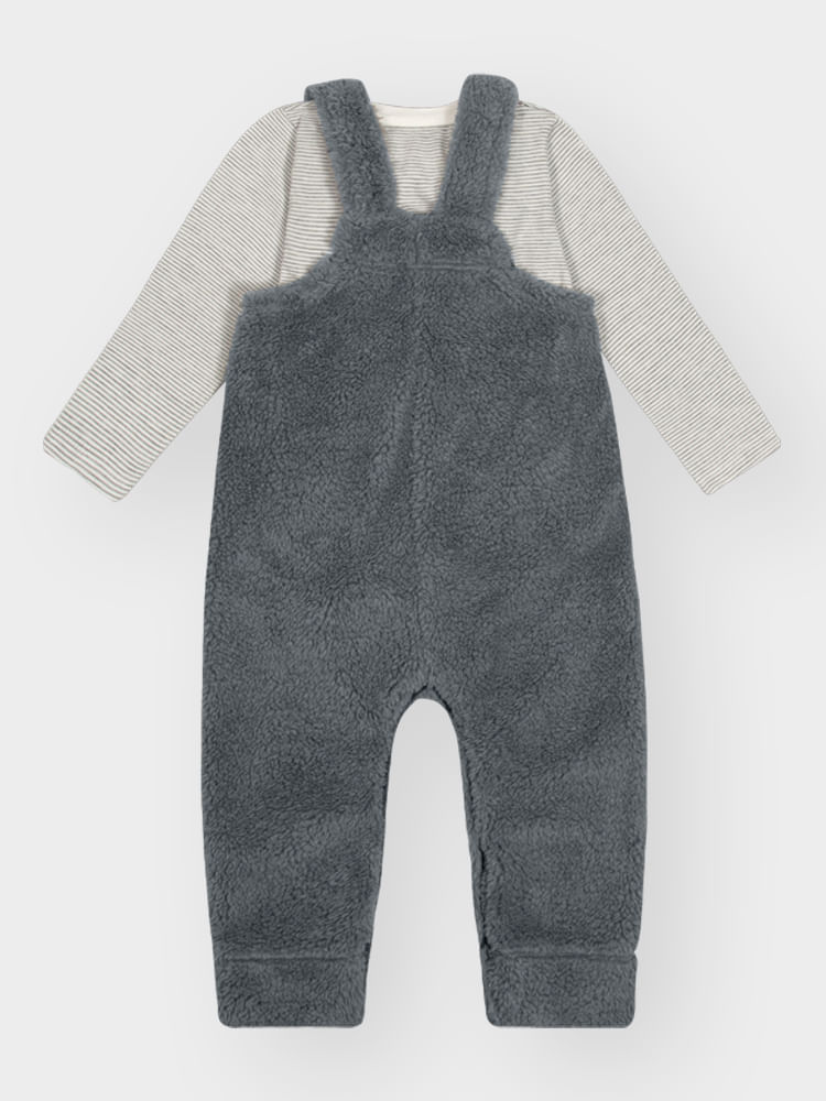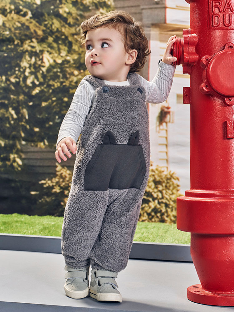 O design destaca-se pelo bolso canguru frontal adornado com delicadas orelhas de lobinho, conferindo um visual divertido e sofisticado ao mesmo tempo. A funcionalidade é garantida pela abertura no ombro com botões de pressão e pela abertura no entrepernas, facilitando as trocas sem comprometer o ajuste térmico proporcionado pelos punhos em pelo carneirinho. A estampa listrada do body é um clássico atemporal da moda infantil, criando um contraste moderno com a textura volumosa da jardineira.