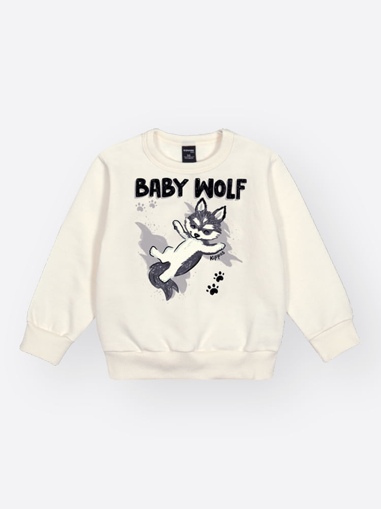 O design do blusão destaca-se por uma estampa frontal centralizada com a temática ""Baby Wolf"", que traz personalidade e charme à peça de forma moderna. Pensando na praticidade, conta com abertura no ombro por botões de pressão, facilitando a rotina de trocas, além de acabamentos premium em ribana nos punhos e na barra. A calça complementa o conjunto com um cós elástico rebatido para ajuste seguro e bolsos embutidos em recortes estratégicos, unindo funcionalidade e um corte contemporâneo.
