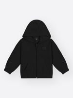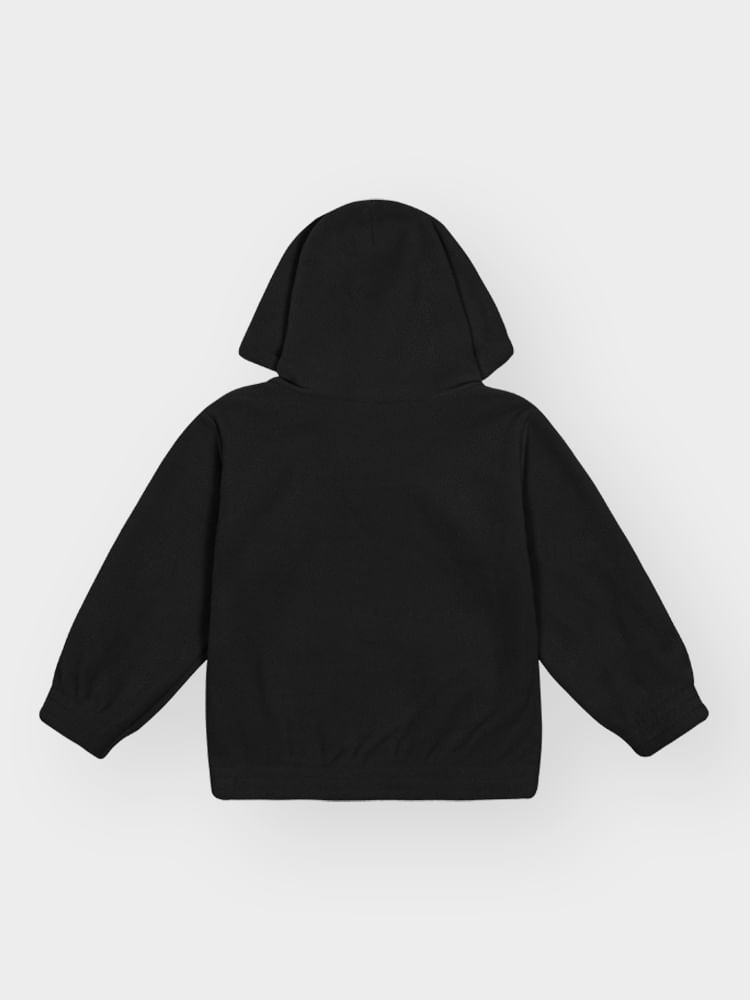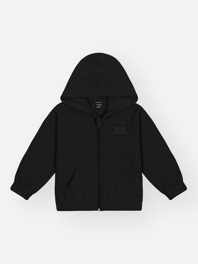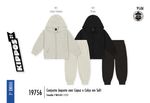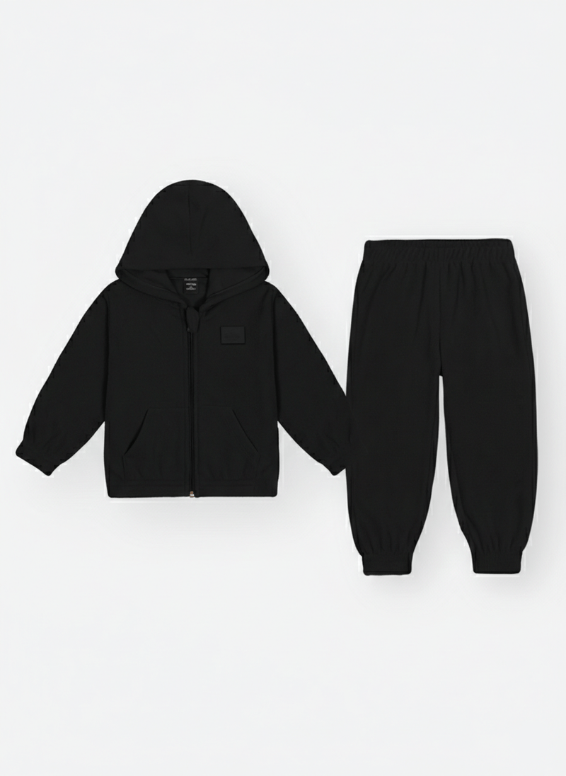 A jaqueta apresenta um design funcional e minimalista, com capuz estruturado, zíper de nylon com protetor de queixo e acabamentos rebatidos com elástico que impedem a entrada do vento. A calça acompanha a proposta de conforto com cós elástico, bolsos frontais práticos e punhos ajustados, garantindo que a peça fique no lugar durante as brincadeiras. Com foco na textura rica e macia do soft, o conjunto possui um visual clean e sofisticado, sem a presença de estampas, o que ressalta a qualidade premium do material e a assinatura discreta da etiqueta decorativa.