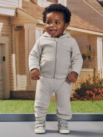 A jaqueta apresenta um design funcional e minimalista, com capuz estruturado, zíper de nylon com protetor de queixo e acabamentos rebatidos com elástico que impedem a entrada do vento. A calça acompanha a proposta de conforto com cós elástico, bolsos frontais práticos e punhos ajustados, garantindo que a peça fique no lugar durante as brincadeiras. Com foco na textura rica e macia do soft, o conjunto possui um visual clean e sofisticado, sem a presença de estampas, o que ressalta a qualidade premium do material e a assinatura discreta da etiqueta decorativa.