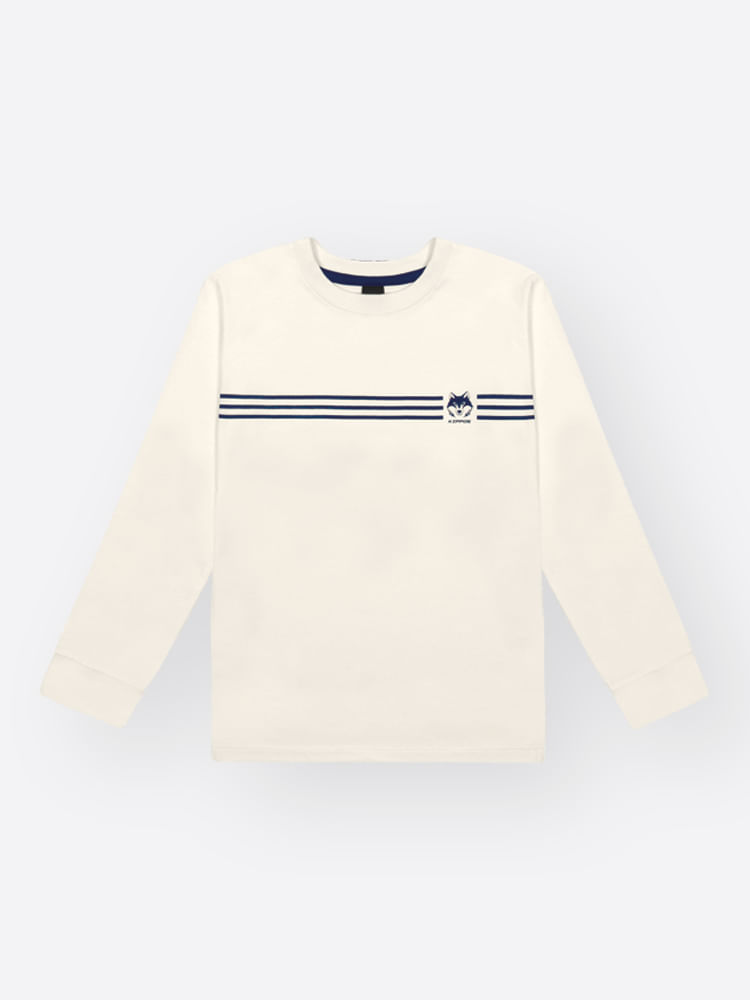 O design é elevado por uma estampa frontal minimalista e moderna, composta por listras horizontais e um detalhe gráfico de lobo, que adiciona um toque de personalidade ""teen"" e urbano à peça. É o item indispensável para quem busca uma camiseta de manga longa versátil, que transita facilmente entre diferentes estilos.