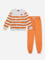 O conjunto ganha personalidade com uma estampa moderna que percorre a frente e as mangas, criando uma continuidade visual que é tendência na moda jovem. Uma etiqueta decorativa aplicada estrategicamente reforça o cuidado artesanal e o posicionamento premium da marca, tornando-o uma peça de destaque em qualquer vitrine de moda infantil.