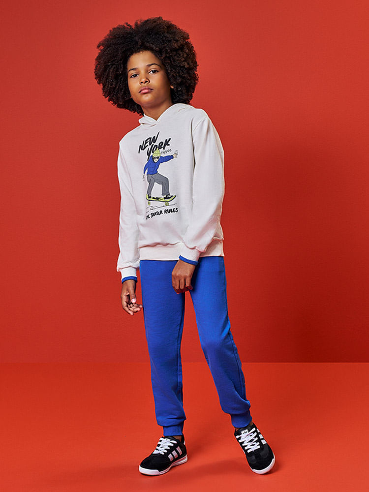 "O Conjunto Infantil Masculino Kippos é a escolha perfeita para unir o conforto do estilo sportswear a um design autêntico e cheio de atitude para os meninos. Confeccionado integralmente em moletom, o conjunto proporciona um toque macio e flexível, ideal para acompanhar o ritmo de movimento nas estações mais amenas. O blusão com capuz destaca-se pela sofisticação tátil da sua estampa em puff, que traz um relevo emborrachado moderno, além de um detalhe fashion diferenciado: o punho duplo em ribana com interno contrastante, que confere um acabamento refinado e exclusivo à peça. A calça jogger completa o visual com praticidade, apresentando cós rebatido, bolsos funcionais com pespontos duplos e punhos em ribana que garantem um caimento estruturado e impecável.