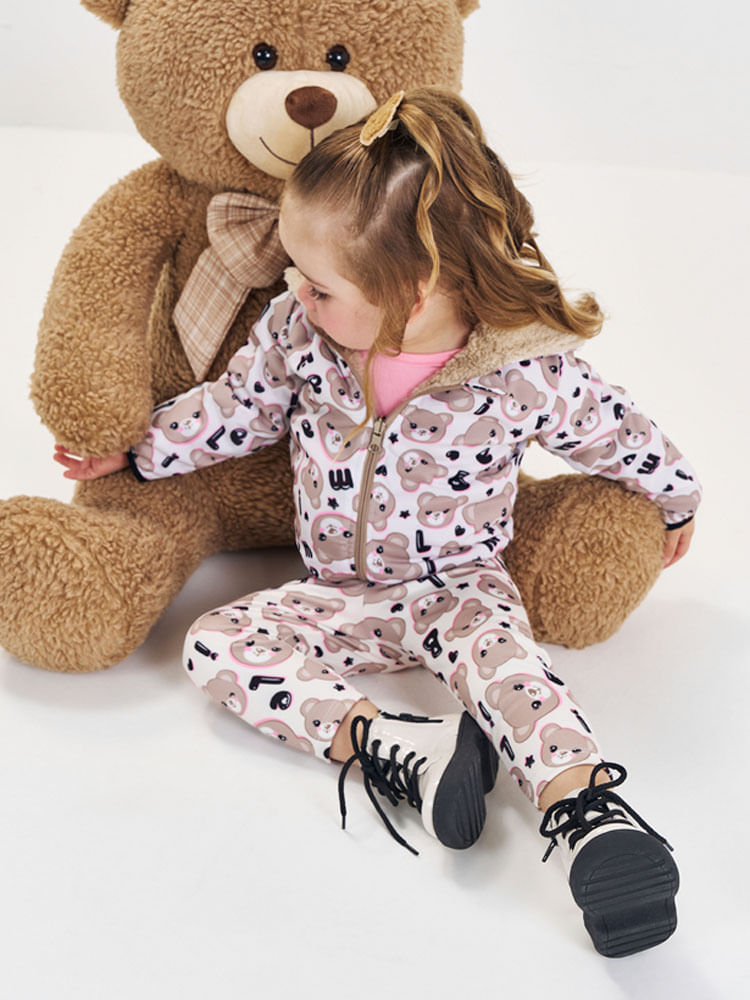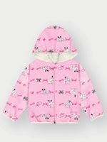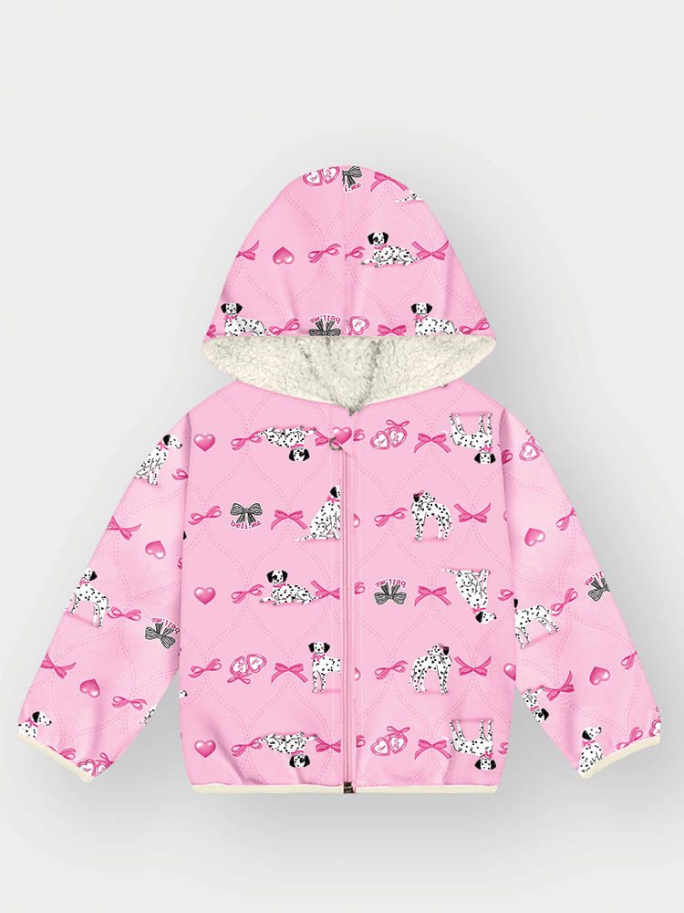 O design funcional é rico em detalhes de alta qualidade, apresentando um capuz generoso com forro em pelo e fechamento frontal com zíper reversível, que conta com protetor de segurança para não irritar a pele sensível da criança. O ajuste é impecável graças ao elástico embutido nos punhos e na barra, que bloqueia a entrada de ar frio e mantém a jaqueta no lugar durante as brincadeiras. As estampas exclusivas trazem o charme das temáticas lúdicas, apresentando padrões delicados de dálmatas, ursinhos e elementos fofos com laços, que conferem um ar lúdico e fashionista à peça.