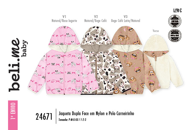 "Eleve o guarda-roupa de inverno com a Jaqueta Dupla Face Beli.me, uma peça versátil que une a resistência do nylon à suavidade aconchegante do pelo carneirinho. Pensada para pais que buscam praticidade e estilo, esta jaqueta oferece duas propostas em uma única peça: de um lado, o nylon estampado com proteção contra o vento e, do outro, a textura ultra macia do pelo carneirinho em tom neutro, garantindo o máximo de conforto térmico para os bebês.