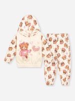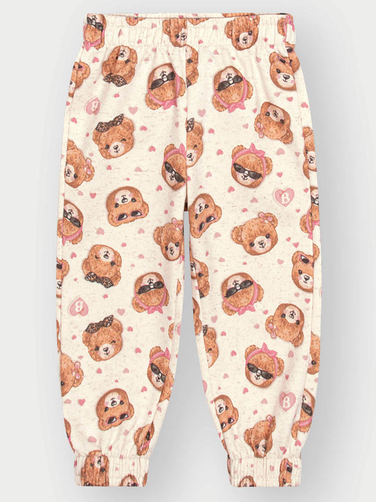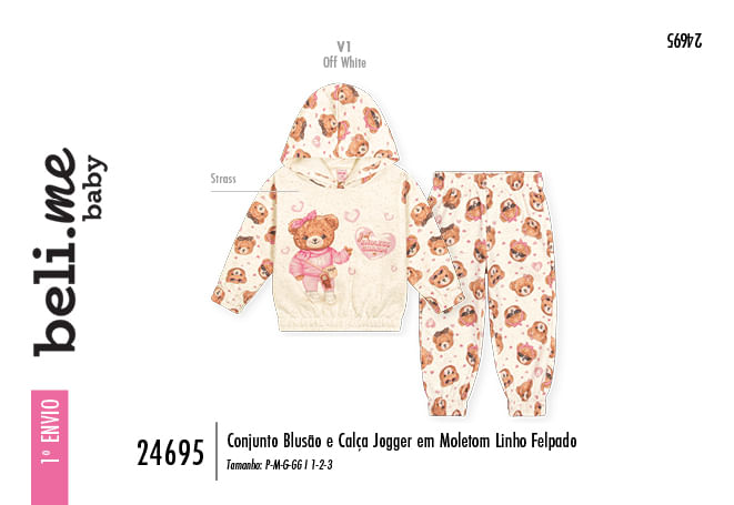A estética da peça é enriquecida por estampas lúdicas de ursinhas fashionistas, aplicadas com técnicas de sublimação de alta definição que garantem cores vibrantes e duradouras. Um toque especial de brilho é adicionado através de detalhes em strass, elevando o conjunto a um patamar de moda premium e exclusiva.