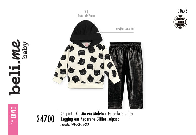 "O Conjunto Blusão em Moletom Flash Felpado e Calça Legging da Beli.me é a escolha definitiva para quem busca alinhar alta tecnologia têxtil ao estilo premium da moda infantil. O blusão é confeccionado em moletom flash felpado, oferecendo um toque extremamente macio e isolamento térmico superior para enfrentar o inverno com máximo conforto. O design destaca-se pelo capuz com orelhas 3D e recortes estratégicos, trazendo um ar lúdico e sofisticado. Acompanha uma calça legging técnica, desenvolvida em material que garante flexibilidade e proteção, finalizada com cós elástico rebatido para um ajuste perfeito ao corpo da criança.